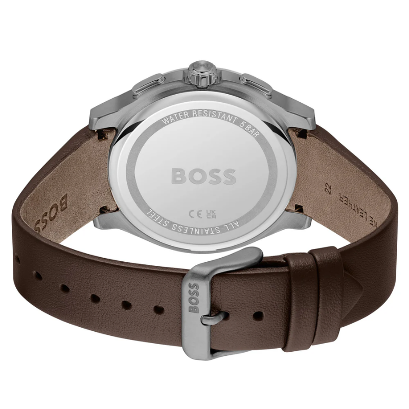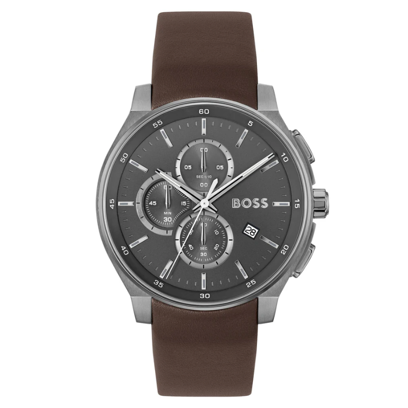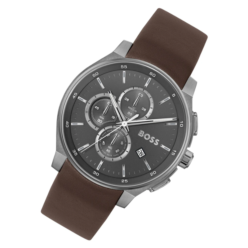 The Hugo Boss 1514187 is a sophisticated men’s watchfeaturing a minimalist grey dial, chronograph functionality, and a durablestainless steel case. Paired with a rich brown leather strap and precise quartzmovement, it offers a perfect blend of modern style, comfort, and reliableperformance for daily wear.