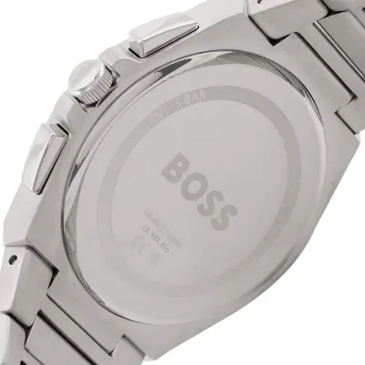 Astatement and ultra sleek Hugo Boss watch for men, this sophisticated designfeatures a polished stainless steel case and a multi-strand polished stainlesssteel bracelet strap with brushed central links for added texture anddefinition. The round dial is silver with black accents, has three handmovement, sub dial chronograph and a date window. The Hugo Boss logo is displayedat the centre right of the dial.