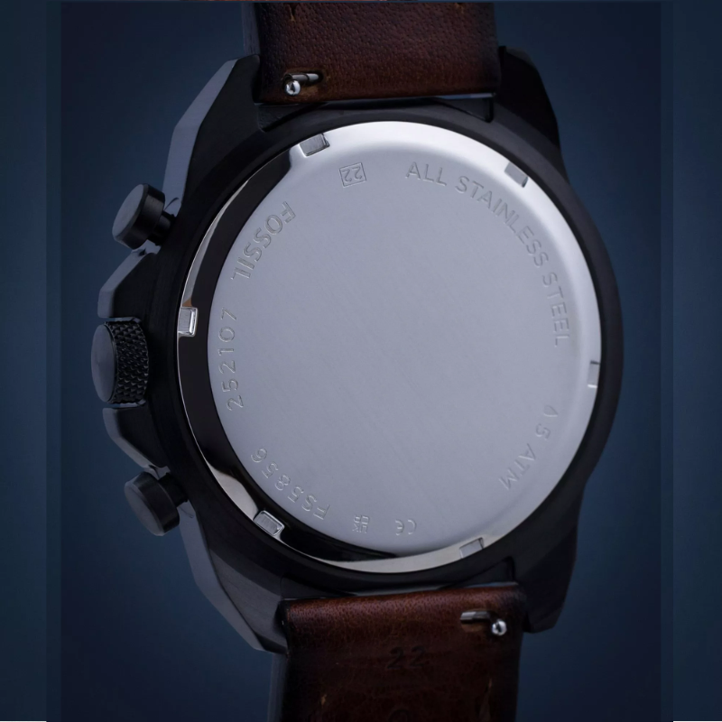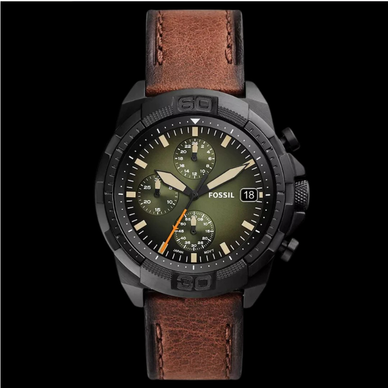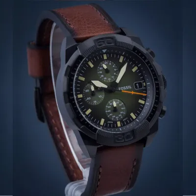 Fossil BronsonChronograph Luggage Eco FS5856 is an ecological chronograph watch made fromcompletely recycled materials. The watch has a green smokey fumè dial protectedwith mineral glass, a date display and three subdials for timekeeping. Thewristband is made of organic leather and is suitable for wrists up to 22 cm.The length of the wristband is adjustable from 160 to 215 mm. The body is 44 mmwide and 12 mm thick. The watch is waterproof up to 50 meters. Battery lifeapprox. 3 years. Fossil watches are shipped in the manufacturer's originalpackaging.
