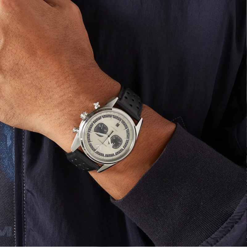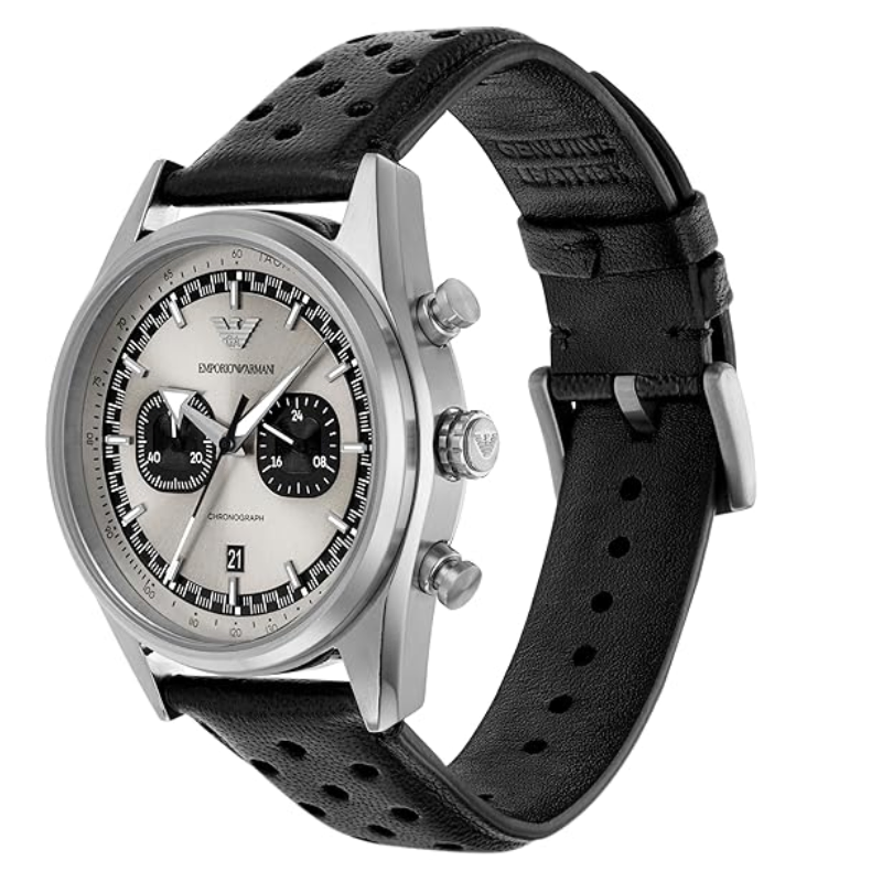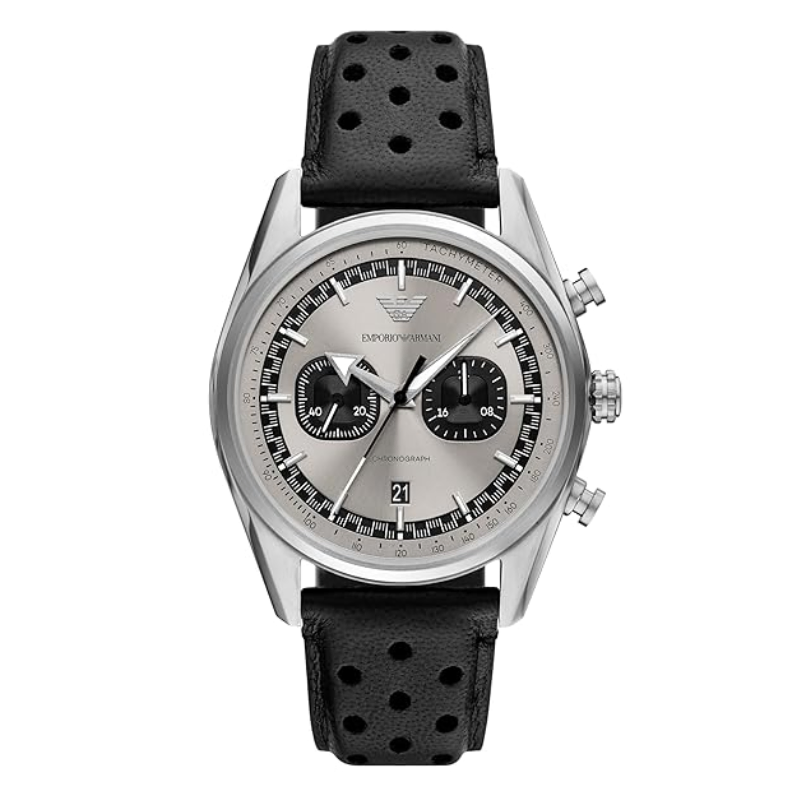 Emporio Armani's 42mmwatch features a round case with a captivating beige sand sunray dial with blackcd textured subeyes. The chronograph movement ensures accurate timekeeping witha functional tachymeter to measure your speed over distance traveled. The blackleather strap with perforations is a nod to the sport-styled heritage of thistimepiece in combination with its added functionality.