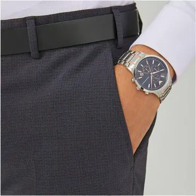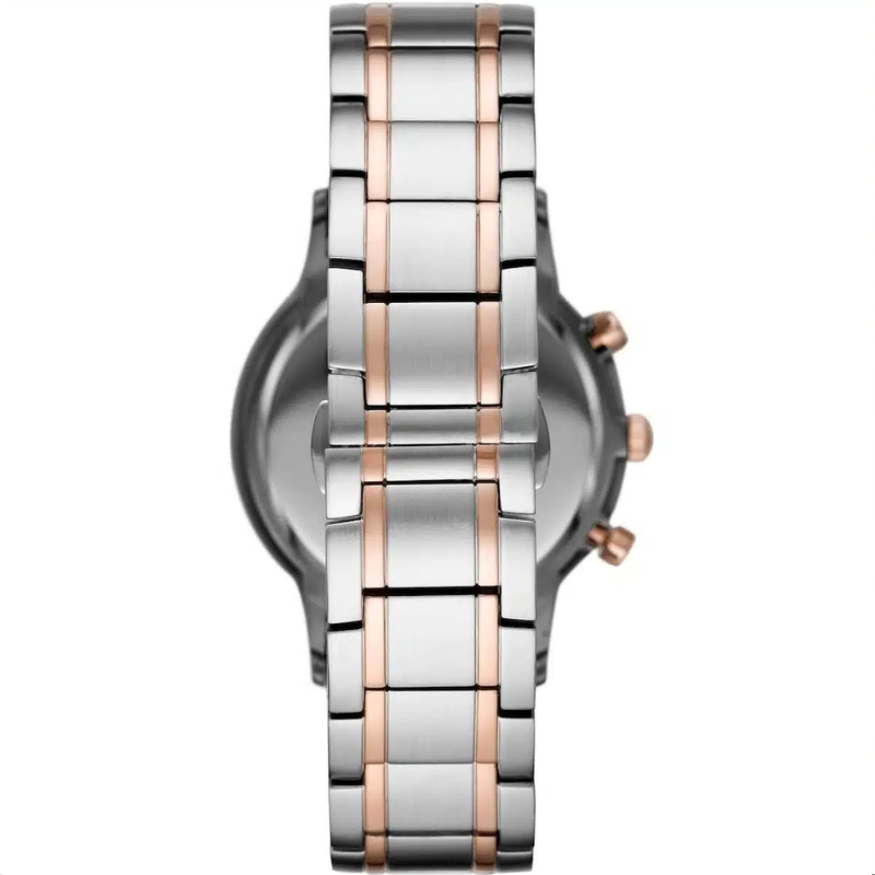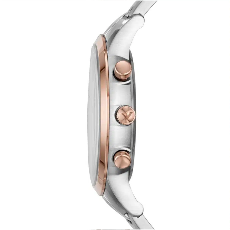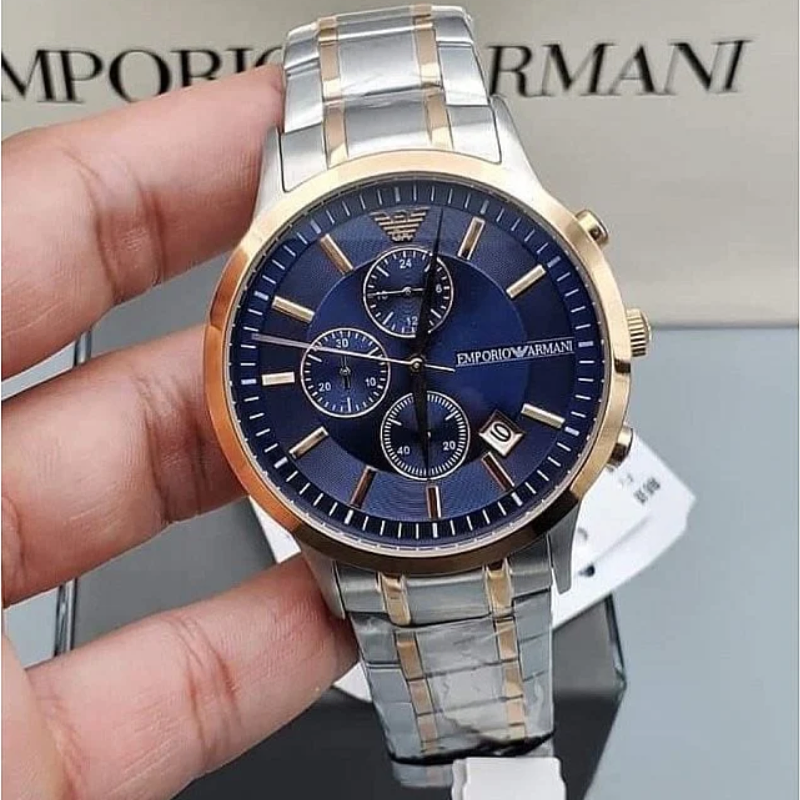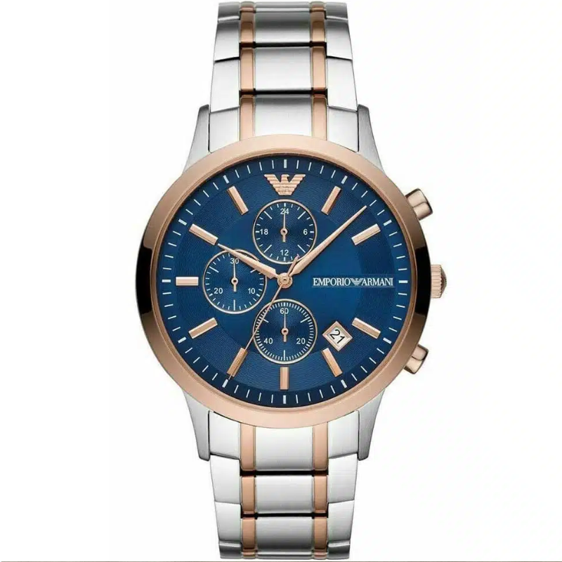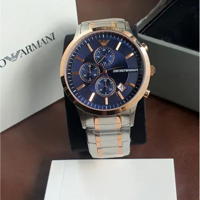 Emporio Armani RenatoAR80025 is a functional and very impressive Gents watch. Case material isStainless Steel while the dial colour is Blue. It has an elegant two-tone strap(Silver and Bronze). This Quartz movement watch has a case size of 43mm and itswater resistance of up to 50m makes it perfect for everyday use and activitiesincluding light sports activities.