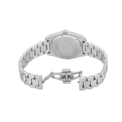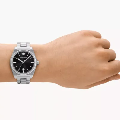 This stainless steeltimepiece features a sleek black dial, silver-tone hour markers, and a polishedbracelet that complements any look — from formal wear to everyday elegance.