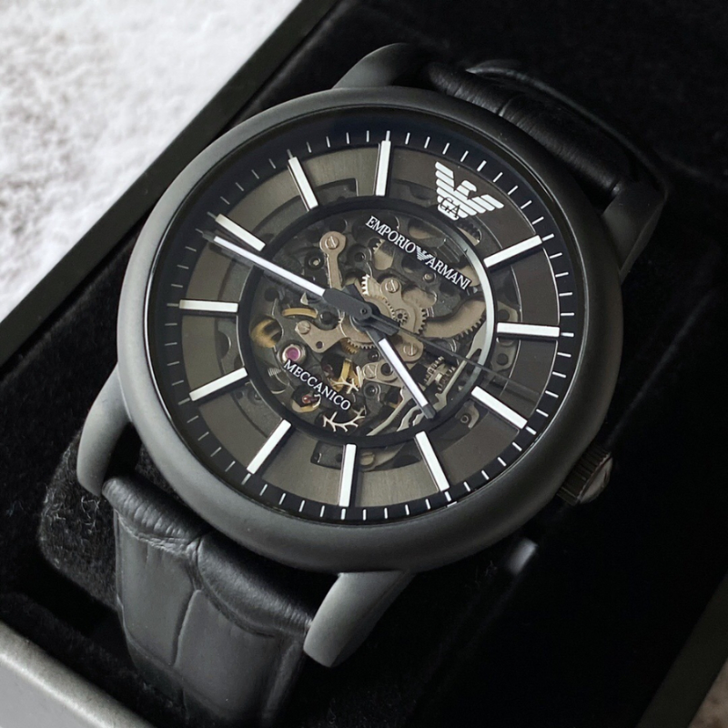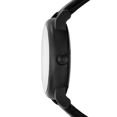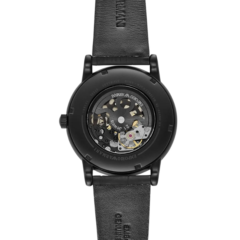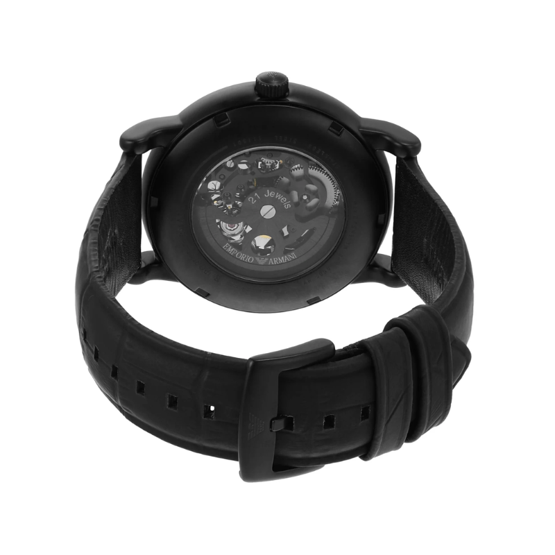 This stylish men's watch fromEmporio Armani features a matte black IP case, matte black skeleton dial with apop of black IP plating on the inner movement and black rubberized leatherstrap.