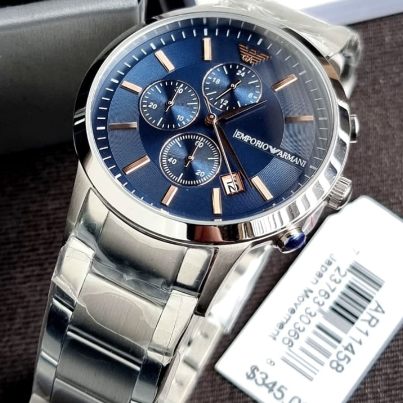 Authentic Emporio Armani Renato Men's Watchfeaturing a sleek blue dial for a modern and sophisticated look. Designed witha durable metal belt strap in a polished silver finish, this timepiece exudeselegance and style. Comes complete with original Armani-branded packaging,including a premium presentation box and a chic shopping bag, making it anexcellent choice for gifting or personal use.