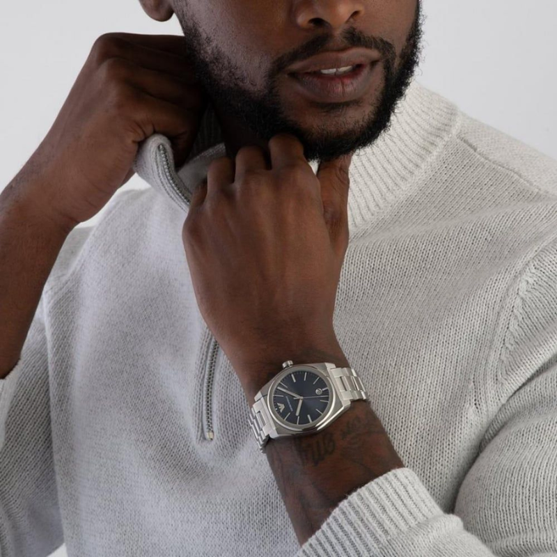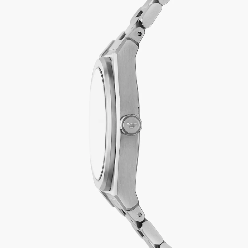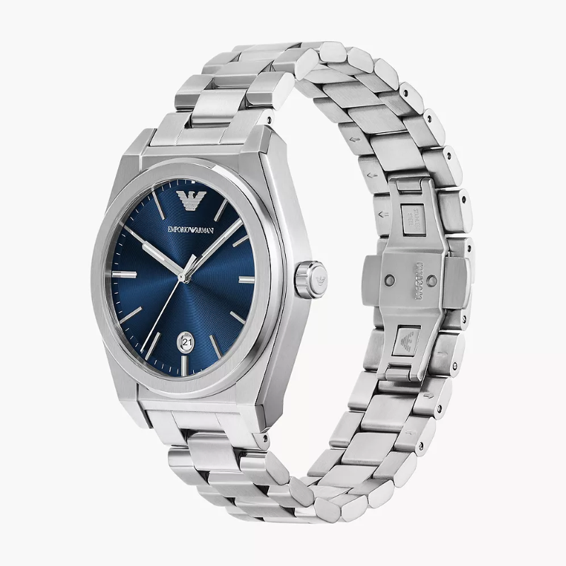 Emporio Armani FedericoSilver blue AR11620 is the perfect sports watch for casual leisure style. The41 mm wide case of this minimalist watch conceals a classic navy blue dial withbeautiful quilloche engraving, line indices and a round date. The streamlineddesign of the watch is completed by the hidden lugs and the look that continuesseamlessly from the body to the bracelet, forming a seamless and dynamic whole.The Emporio Armani Federico Silver blue AR11620 is supplied in the originalmanufacturer's box and comes with a two-year warranty