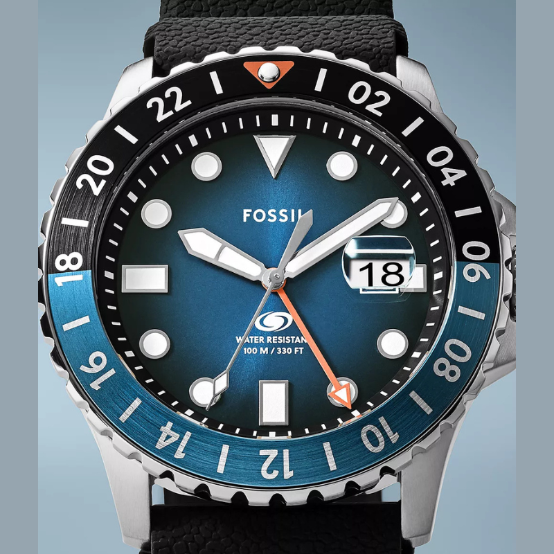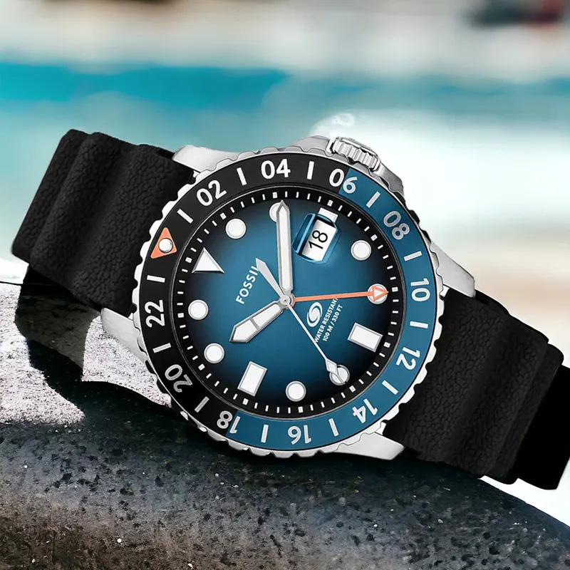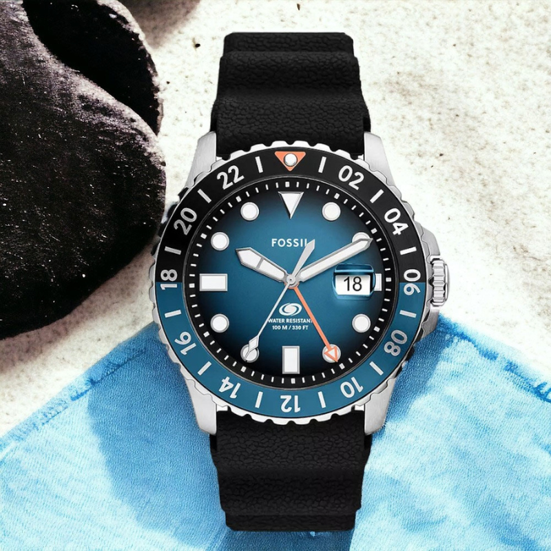 The Fossil Blue GMTFS6049 men's watch operates on a Japanese Miyata 2115 quartz movement with a3-year service life. A black and blue bezel is placed on the silver stainless-steel envelope. The watch features a GMT pointer and a date of the days of the month with a magnifying glass. The whole is complemented by a silicon strap. The model's water resistance is estimated at 10 ATM.