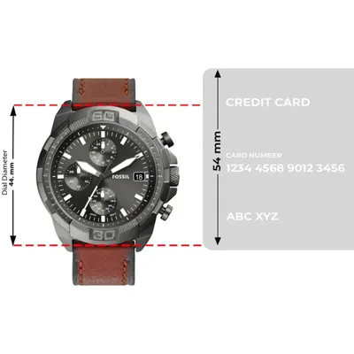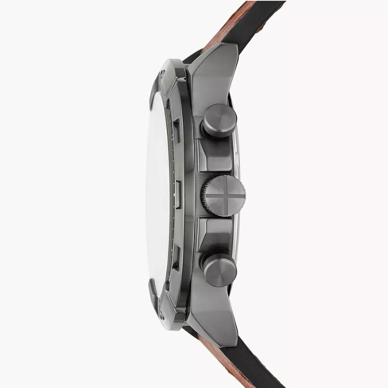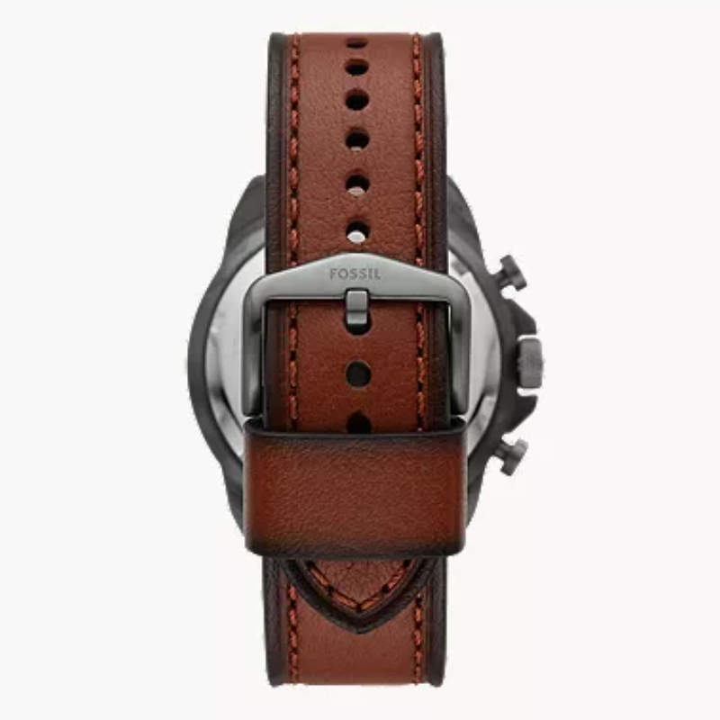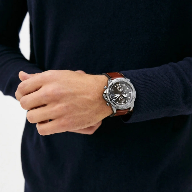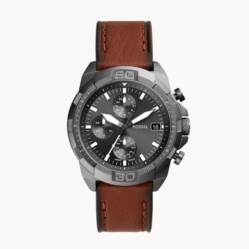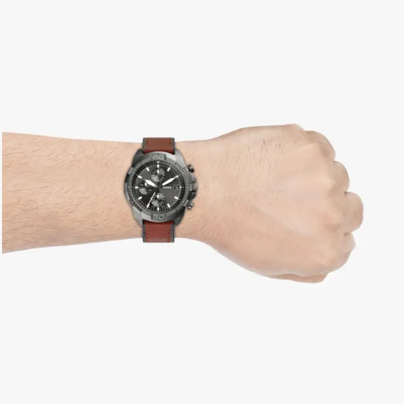 The FossilBronson Chronograph FS5855 is a casual men's watch, operating with abattery-powered quartz movement. The brown leather-trimmed strap is set hereagainst a round envelope, for which gray stainless steel is used. The polisheddial in a similar shade is protected by mineral glass. Among the product'sfeatures are a day-of-the-month date, chronograph and daily time. The model isresistant to major splashes.