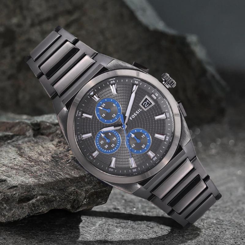 The Fossil FS5830 isa bold, masculine chronograph that blends modern industrial styling withreliable precision. Crafted from stainless steel and highlighted with strikingblue accents, this timepiece perfectly captures Fossil’s signature fusion ofrugged durability and sleek sophistication.