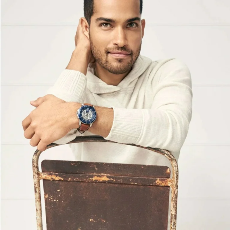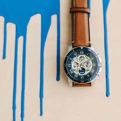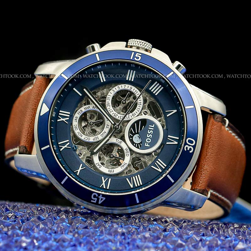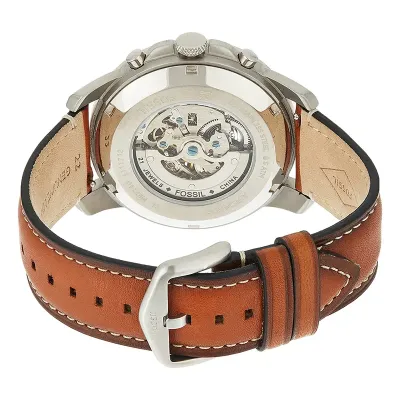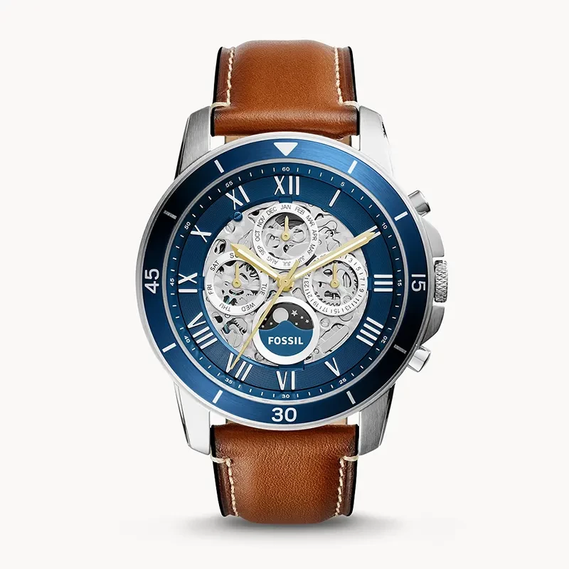 The Fossil Grant is a distinguished men'swatch that exudes both elegance and functionality. With a 44mm stainless steelcase in a sleek silver tone, it houses a captivating blue dial protected by ascratch-resistant mineral crystal. The transparent case back reveals theintricate automatic movement within, ensuring reliable timekeeping. Its roundcase is complemented by a stylish blue bezel and a comfortable light brownleather strap, fastened securely with a tang clasp. Water-resistant up to 50meters, the ME3140 is perfect for everyday wear, offering a casual yet refinedlook. A sport automatic men's watch featuring a blue dial, stainless steelcase, and light brown leather strap. Stylish and reliable.