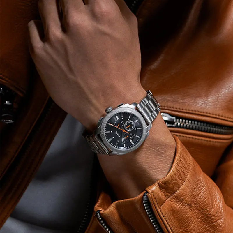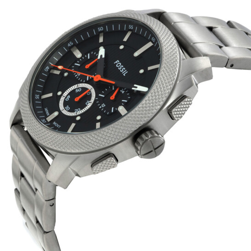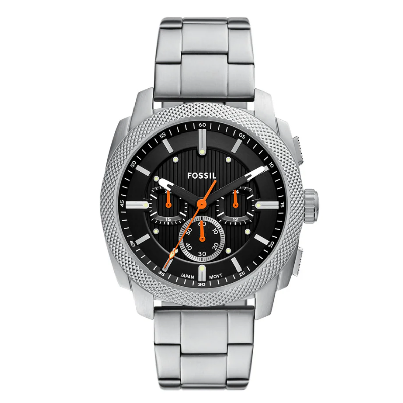 Inspired by classicAmerican machinery, the Machine Chronograph commands attention with its boldknurled top ring. Unmistakably masculine with a bold 44 mm case housing abrushed black dial with textured details, all protected by a mineral crystalface. Powered by a precision quartz chronograph movement, this rugged timepieceis built to last with a durable stainless steel bracelet. A true statement inindustrial-inspired design.