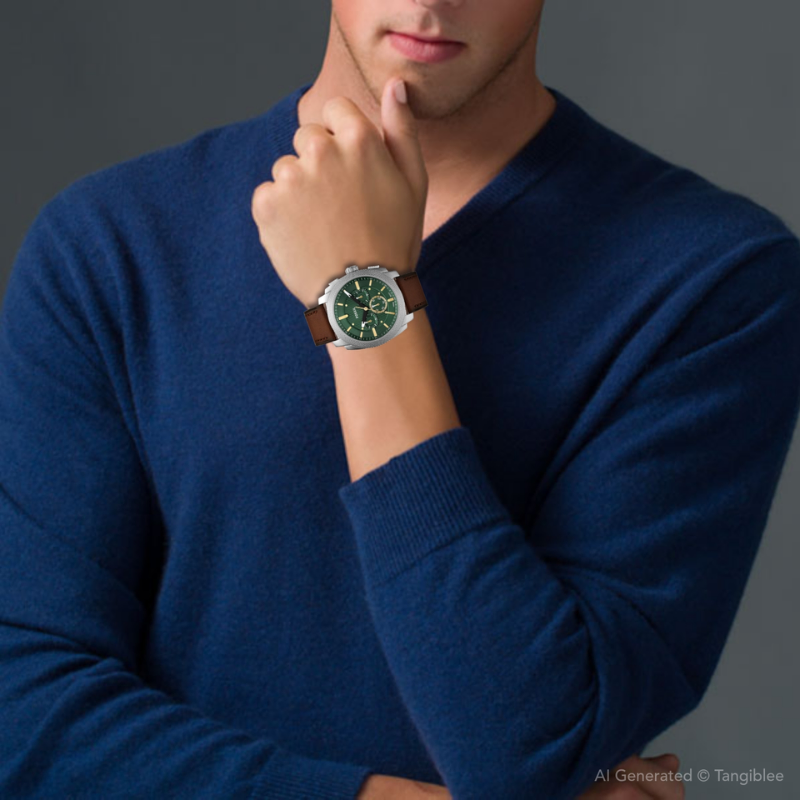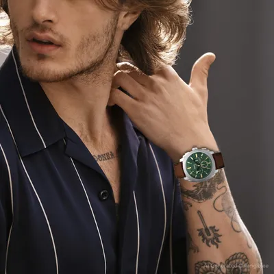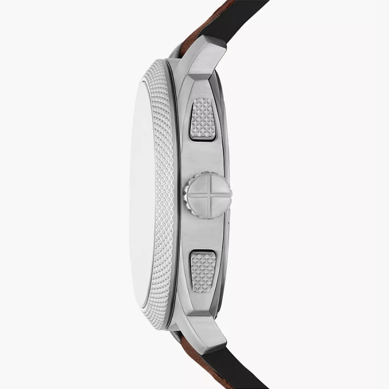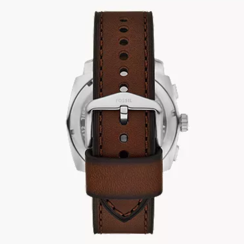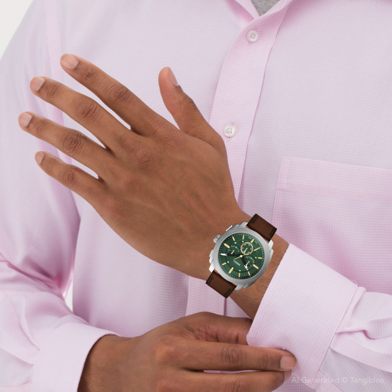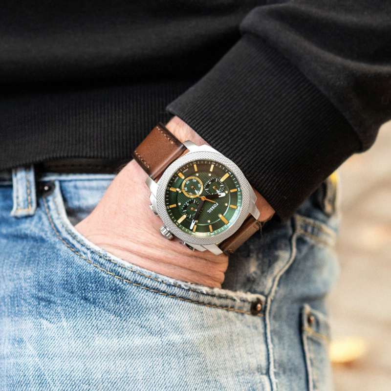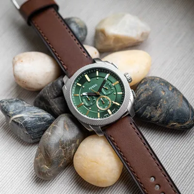 Inspired by classicAmerican machinery, the Machine Chronograph commands attention with its boldknurled top ring. Unmistakably masculine with a bold 44mm case housing abrushed green dial with textured details, all protected by a mineral crystalface. Powered by a precision quartz chronograph movement, this rugged timepieceis built to last with a rich brown leather strap. A true statement inindustrial-inspired design. Fossil leather products support responsiblemanufacturing via the Leather Working Group.