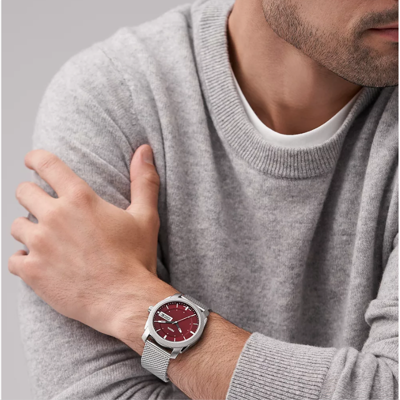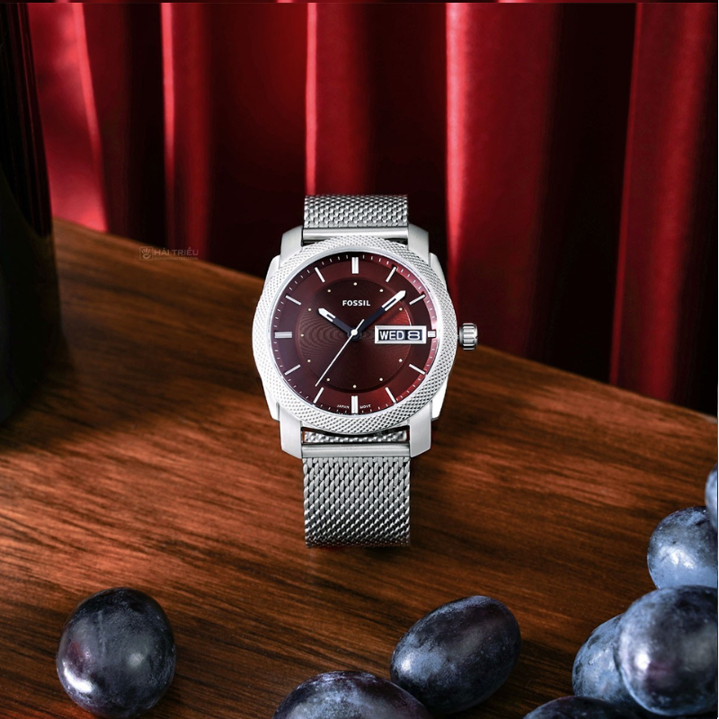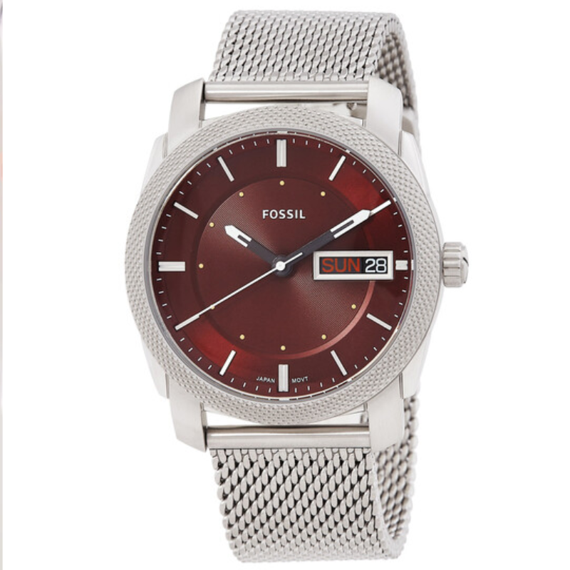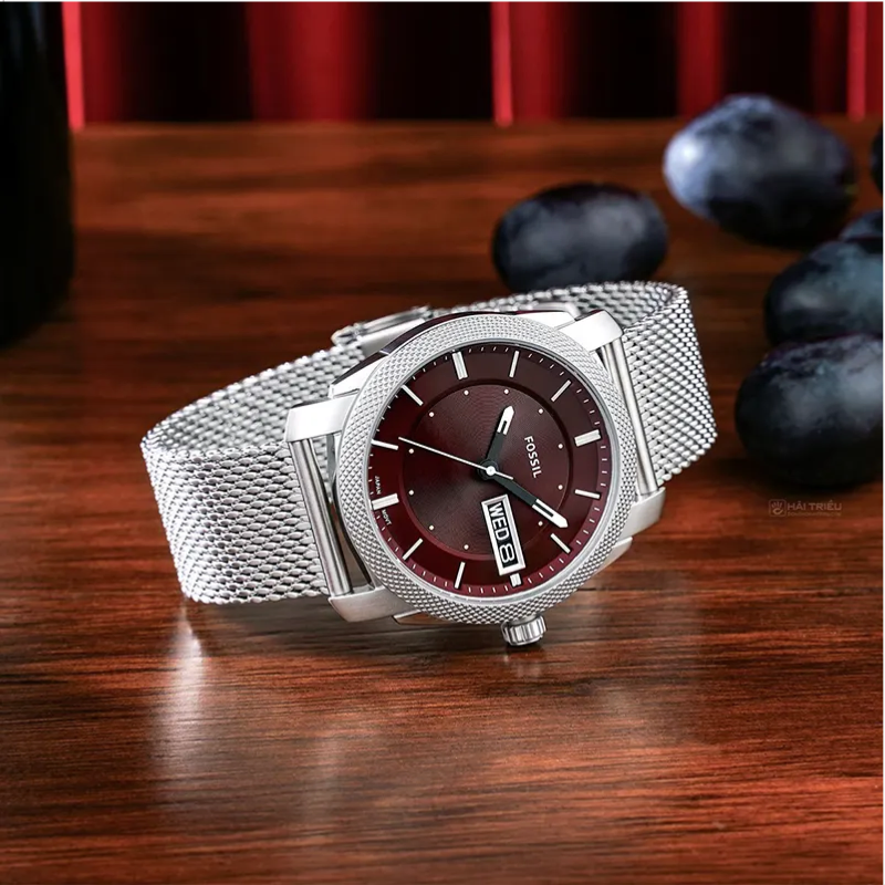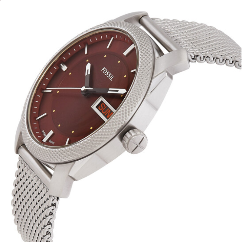 The Fossil MachineFS6014 men's watch will add flavor to your casual creations. The burgundy dialis complemented with a day-of-the-month date, day-of-the-week date andprotected by mineral glass. The accessory works on the basis of a Japanesequartz movement Citizen Miyota GL12. The product features a screw-downcaseback. Water resistance is rated at 5 ATM.