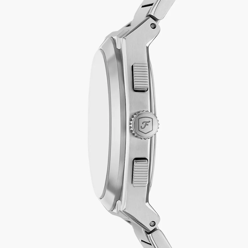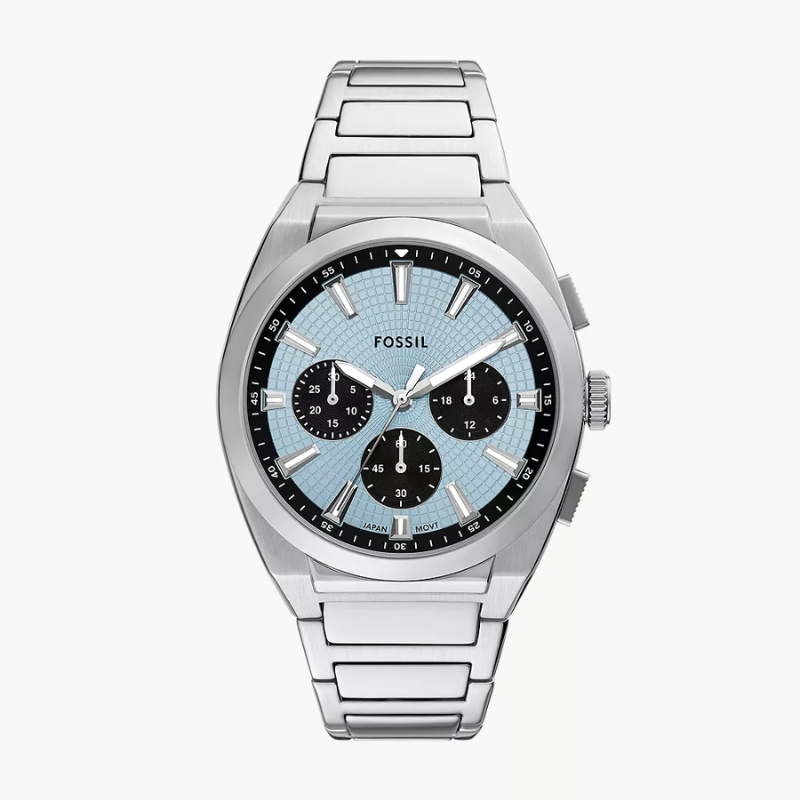 The Fossil FS6105 Everett Chronograph Watch combines modernstyle with reliable performance. It features a light blue textured dial withchronograph sub-dials, a durable stainless steel case and bracelet, and precisequartz movement. With its sporty yet refined design and 50 m water resistance,it’s perfect for everyday wear and smart occasions.