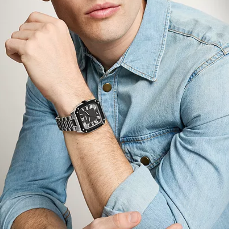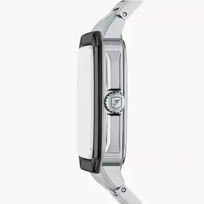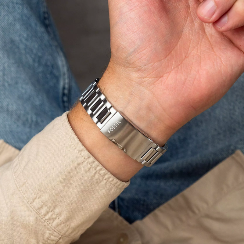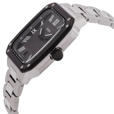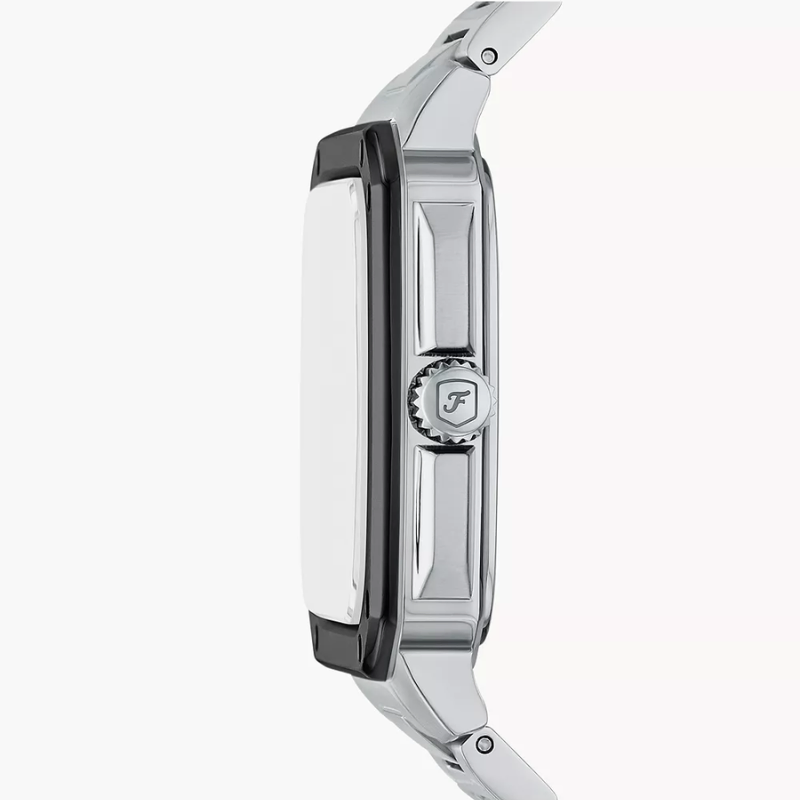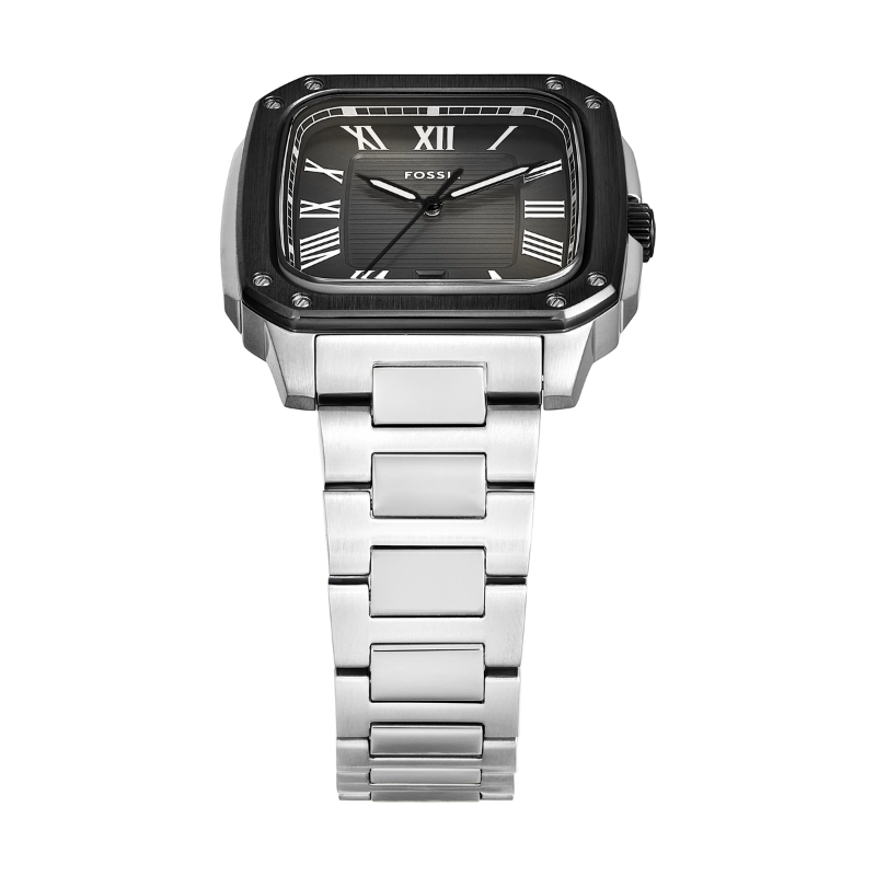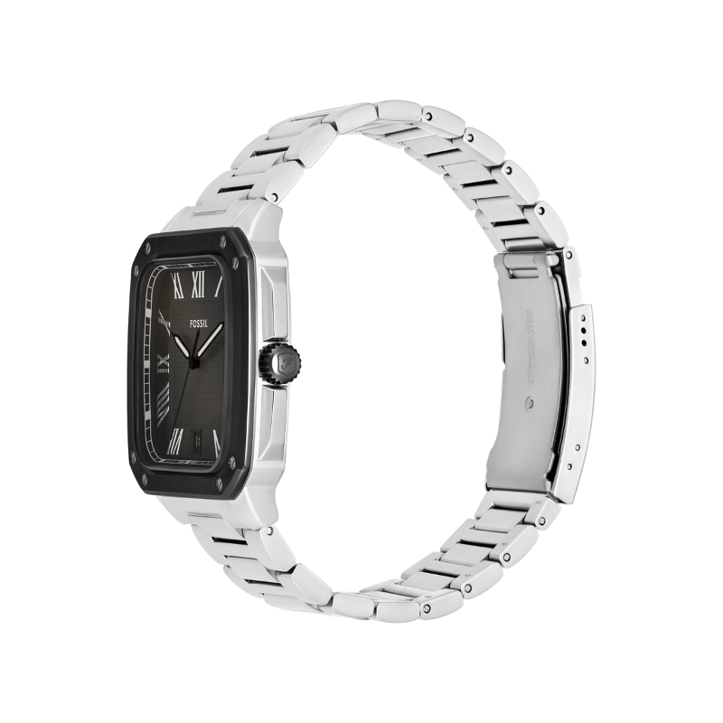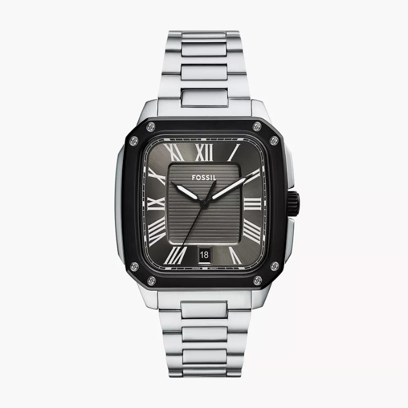 Modern classic Crosbywatch featuring a rectangular stainless steel case, gray textured dial withdate window, and durable steel bracelet—perfect for everyday style.