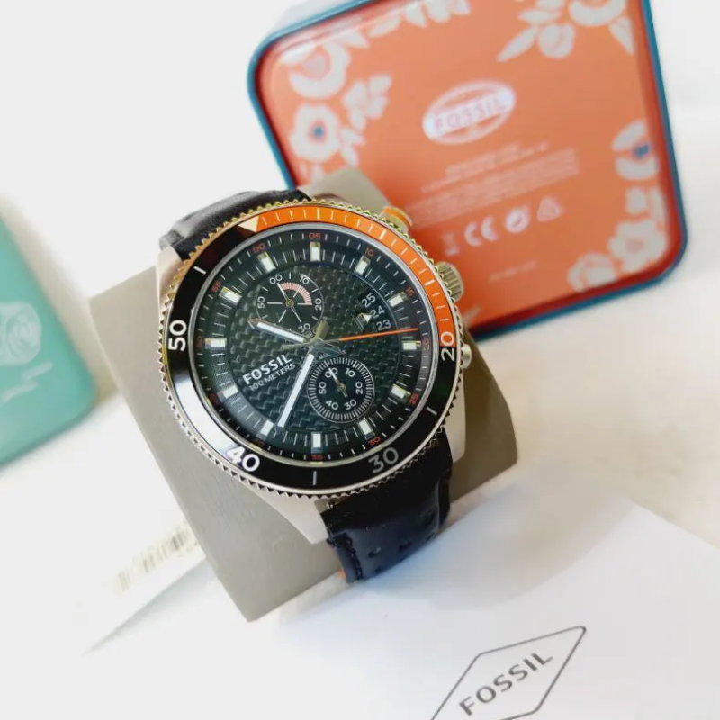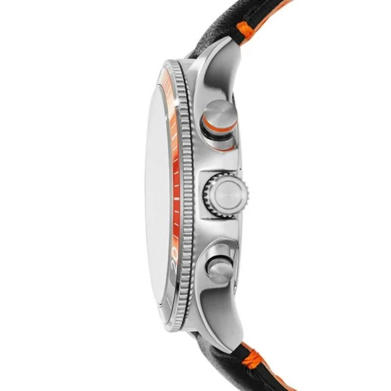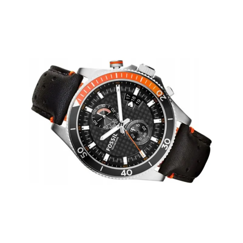 Fossil CH2953Wakefield chronograph mens watch features a 45mm wide and 12mm thick solidstainless steel case with a unidirectional rotating orange accented black bezeland a textured pushpull crown with function pushers Fossil CH2953 is powered byan accurate quartz chronograph movement