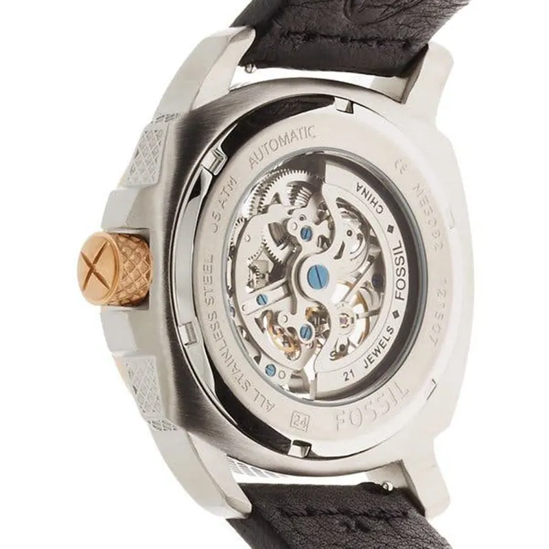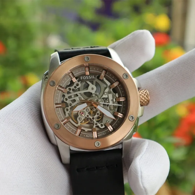 Fossil ME3082 is a stylish automatic skeleton watchfeaturing a rose-gold tone stainless steel bezel, brown dial with exposedmechanical movement, and a genuine black leather strap. This premium Fossilmen’s watch combines classic craftsmanship with modern design, making itperfect for both casual and formal wear.