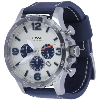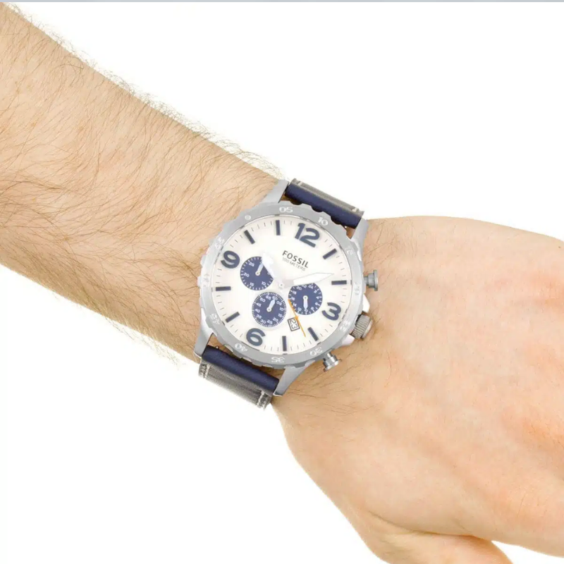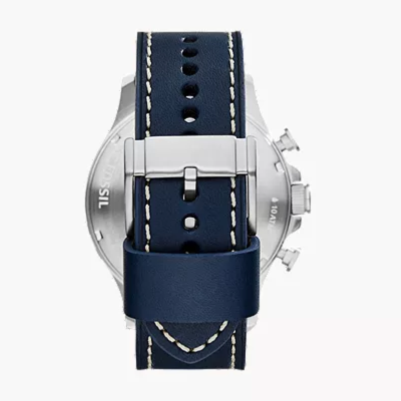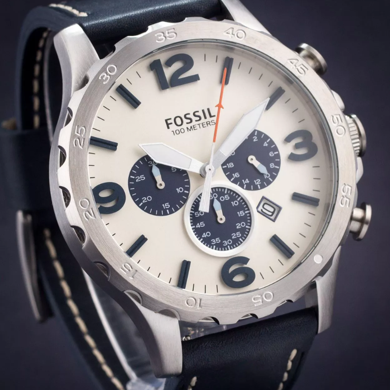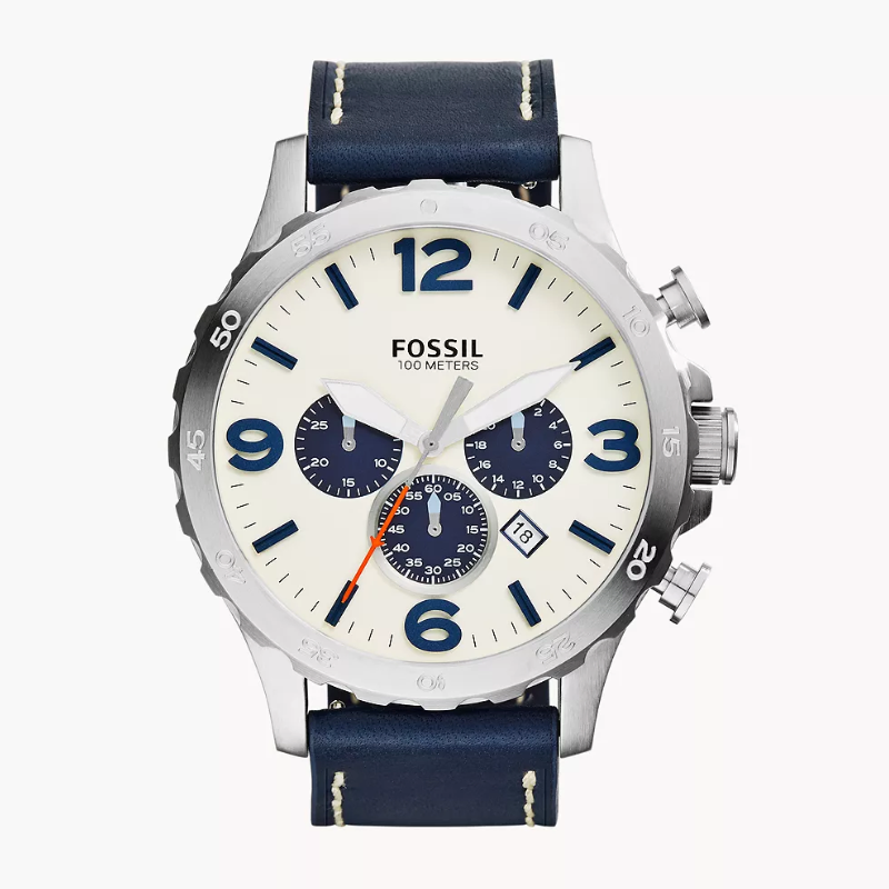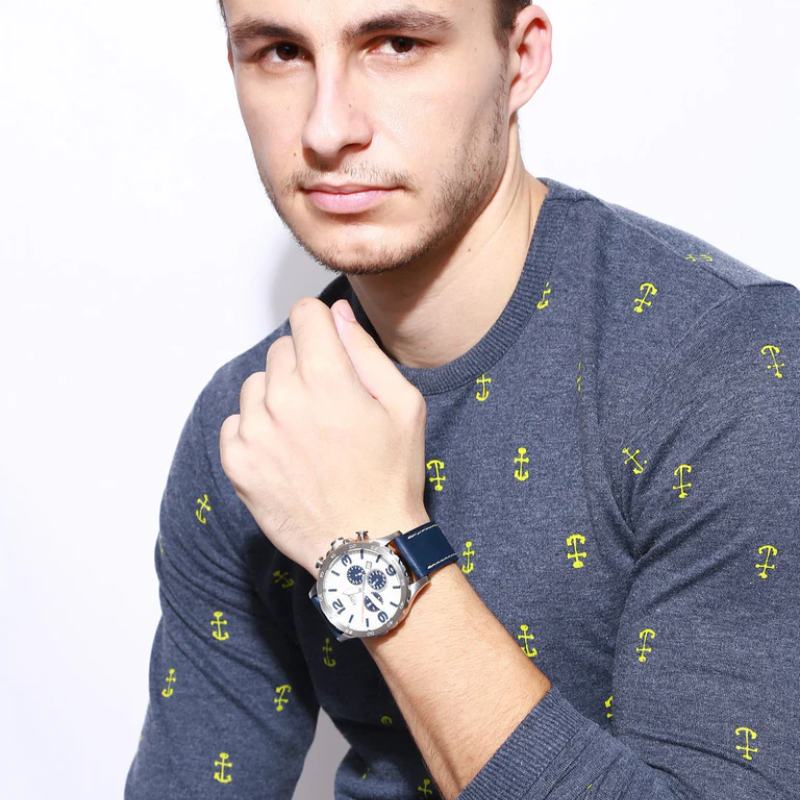 Stainless steel case with a navy blue leather strap and fixed bezel. Beige analog dial with luminous hands, index markers, and Arabic numerals at 3, 6, 9, and 12. Features chronograph sub-dials, date display, quartz movement, scratch-resistant mineral crystal, and water resistance up to 30m. Case size: 50mm with a secure tang clasp.