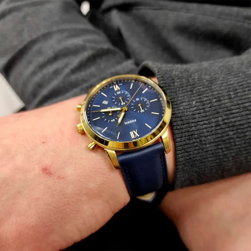 Make every second count with the Neut Chrono watch from Fossil. A super versatile timepiece, it's the perfect dawn to dusk accessory. A vivid blue dial with Roman and linear indexes in gold is complemented perfectly with a gold-tone case. The navy leather strap brings the watch together.