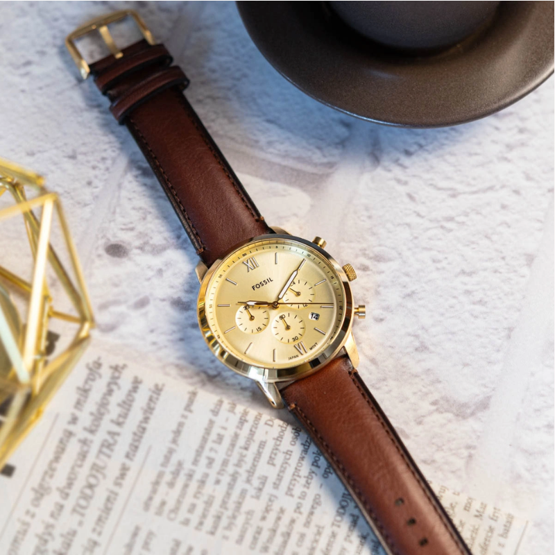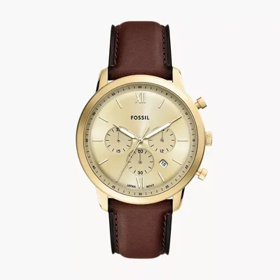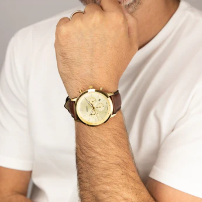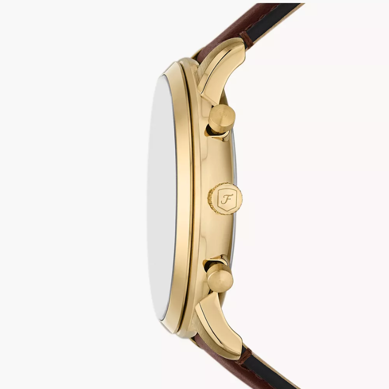 Incorporatingelements from Mid-Century architecture, this chronograph features awell-balanced construction, decorated with a minimal champagne sunray dial andsculpted gold-tone stainless steel case. A domed mineral crystal and preciseJapanese movement lend this standout timepiece both precision and iconic style.Fossil leather products support responsible manufacturing via the LeatherWorking Group.