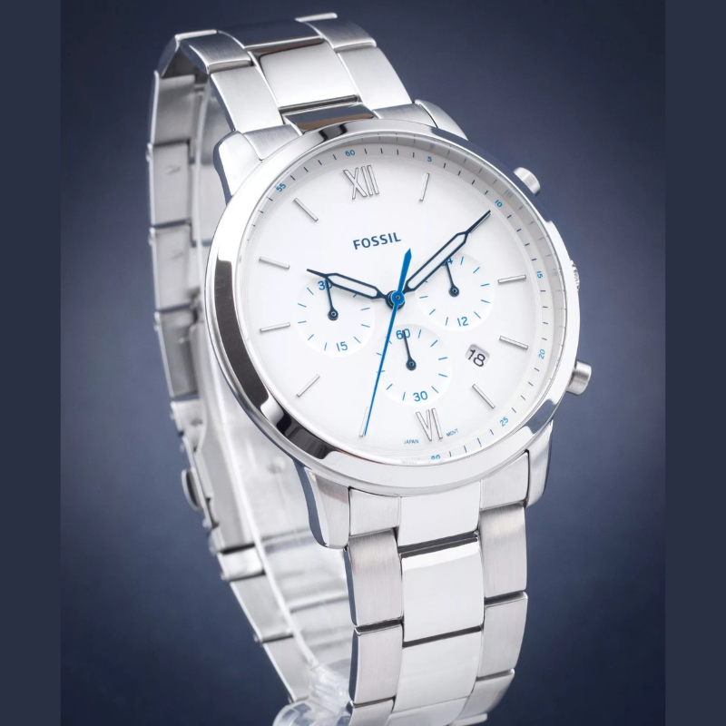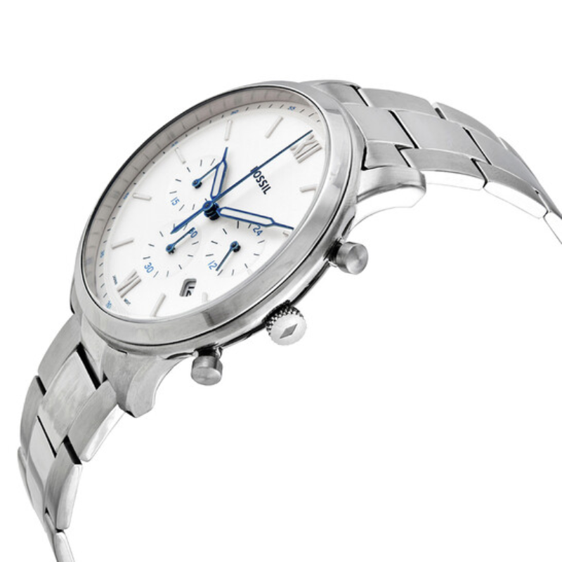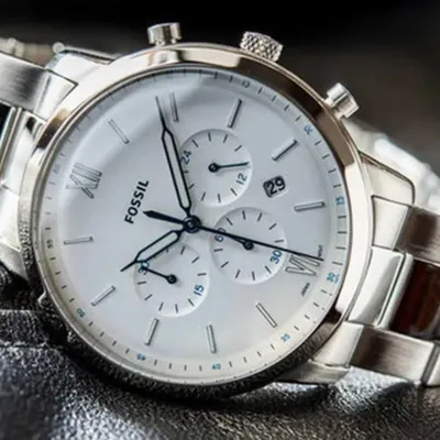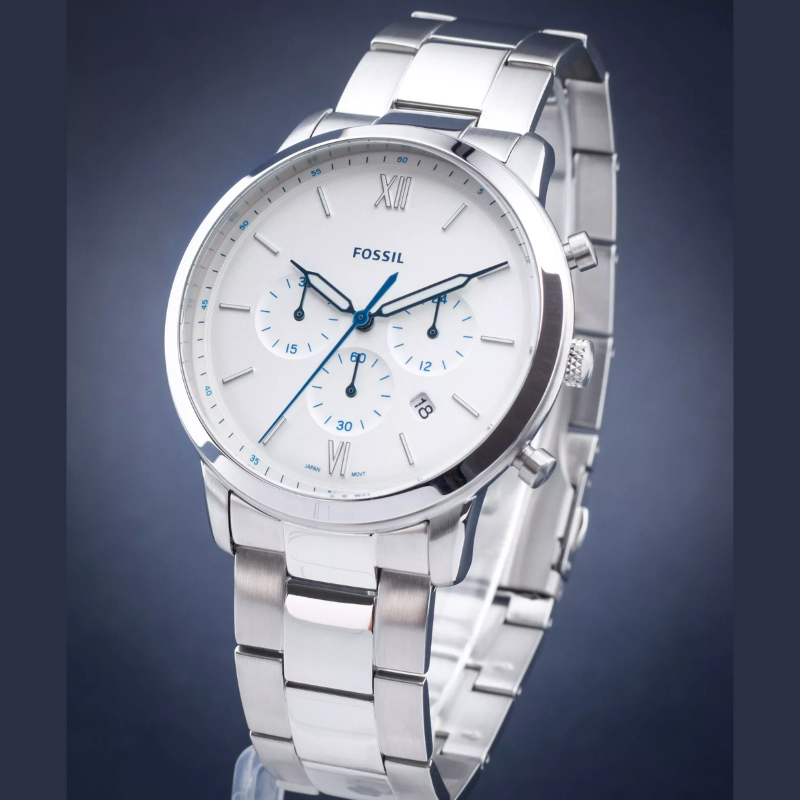 In love with classic looking pieces? Then, this Neutra series watch by Fossil is totally for you and is sure to fit that bill. The white satin colored dial, three sub-dials, three white Lum hands with stick indices except at 6/12hr, a date window and chronograph movement. A silver three-link bracelet fastens the dial around your wrist. All this is enclosed in a stainless steel case with a screw case back. The watch is absolutely sturdy and would definitely last you a lifetime.