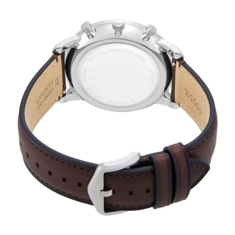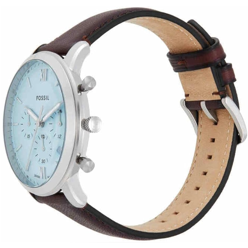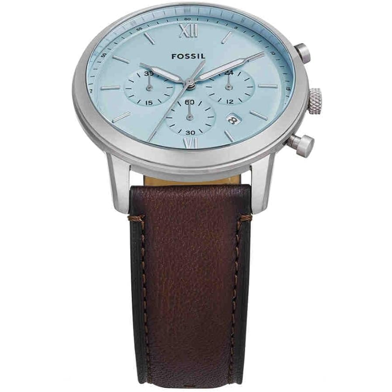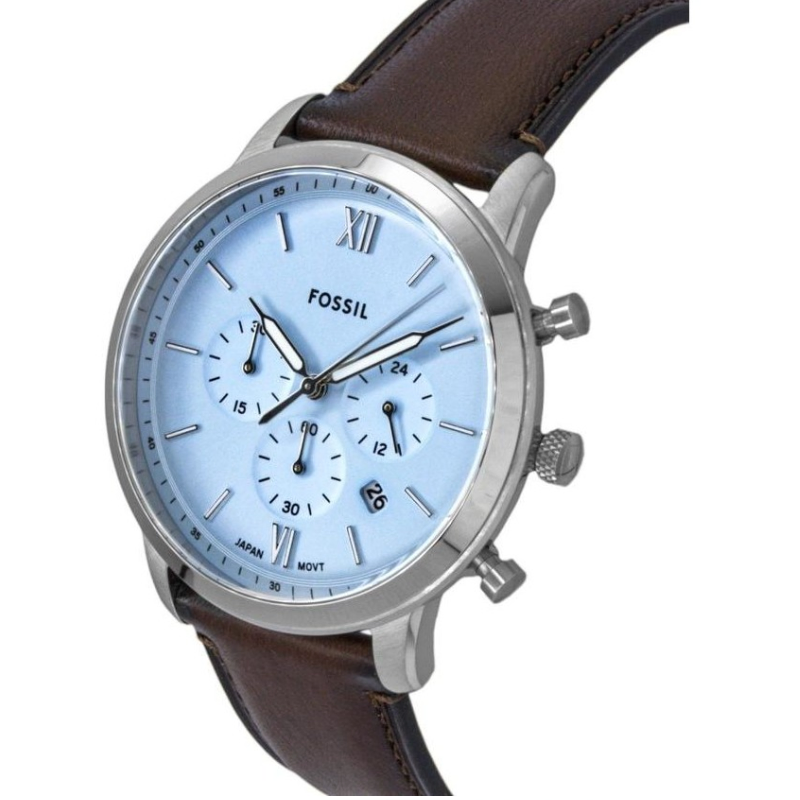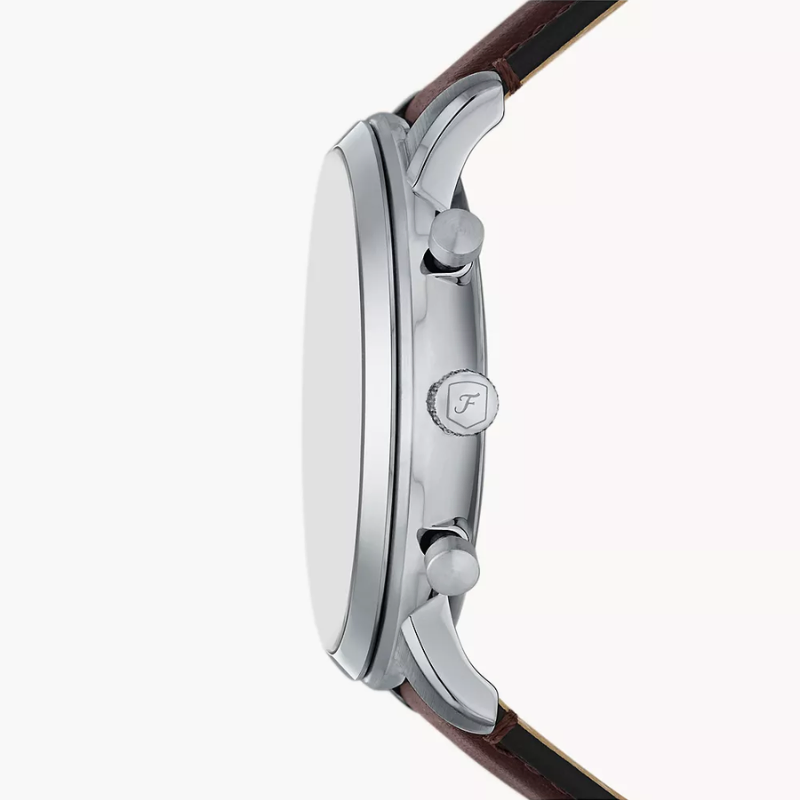 Incorporatingelements from Mid-Century architecture, this chronograph features awell-balanced construction, decorated with a minimal blue sunray dial andsculpted case. A domed mineral crystal and precise Japanese movement lend thisstandout timepiece both precision and iconic style. Fossil leather productssupport responsible manufacturing via the Leather Working Group.