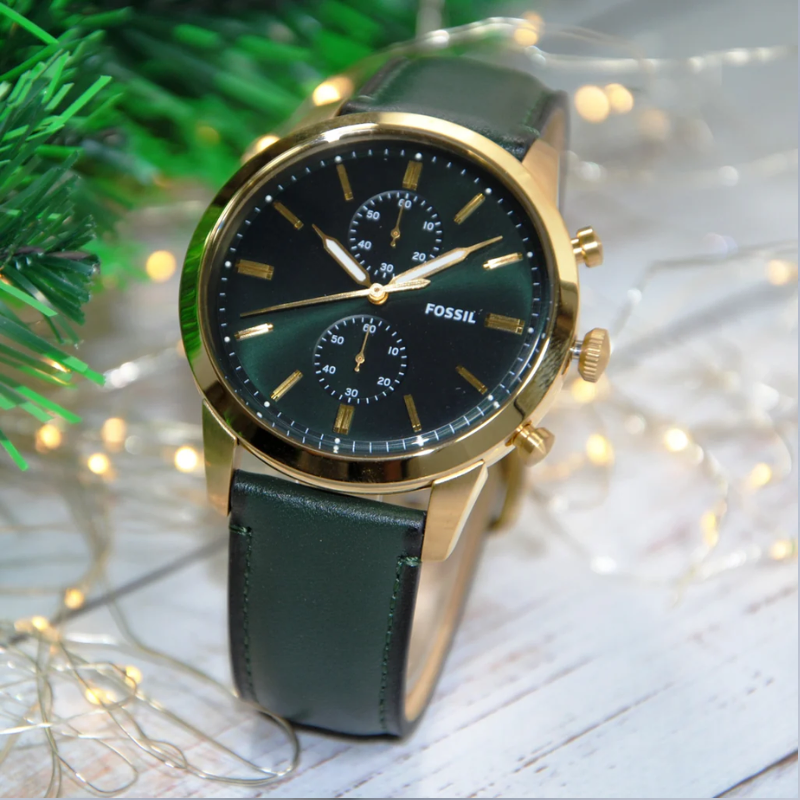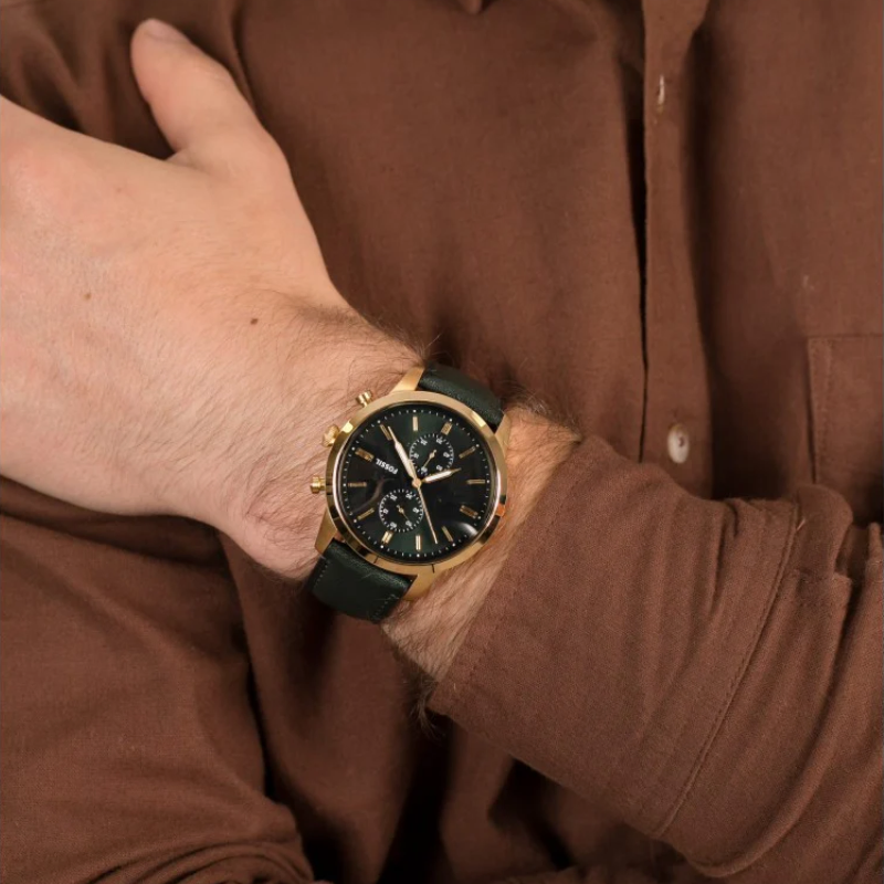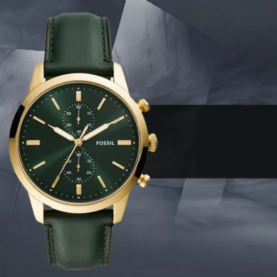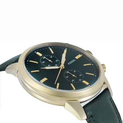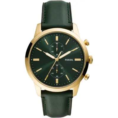 Reinvented Fossil Townsman chronograph watch featuring a 44mm case, green sunray dial with stick indices, dual sub-dials, precise chronograph movement, and a soft dark green leather strap with pin-buckle closure. Perfect blend of modern elegance and classic design.