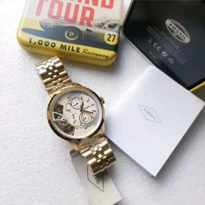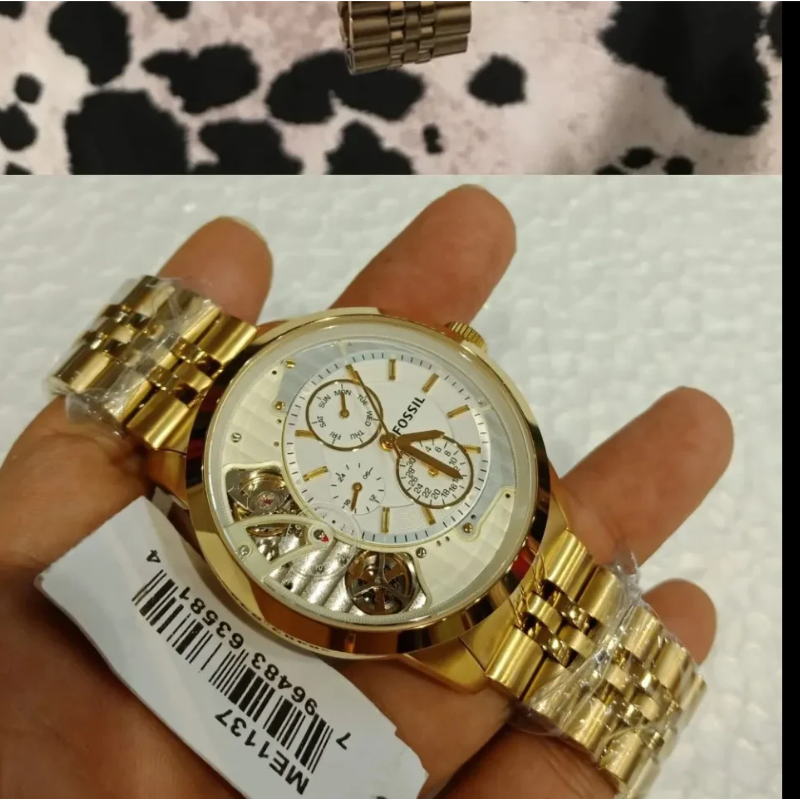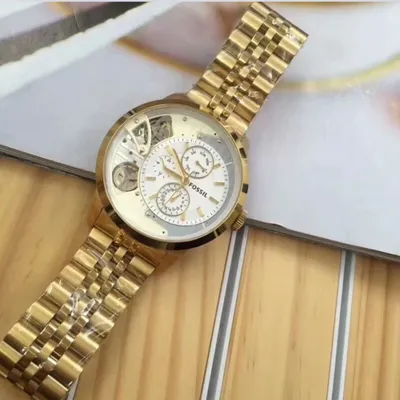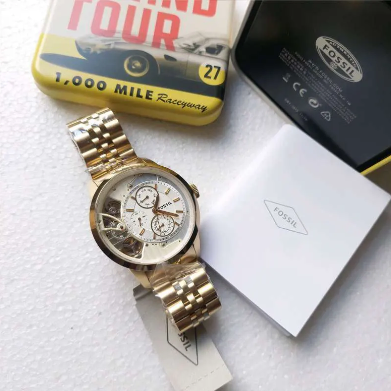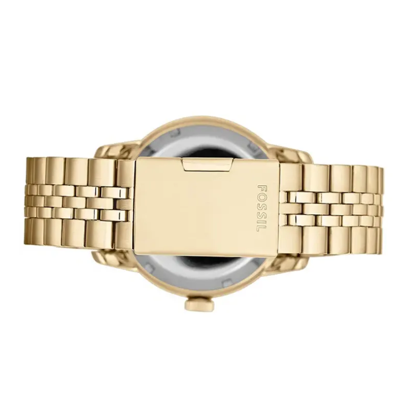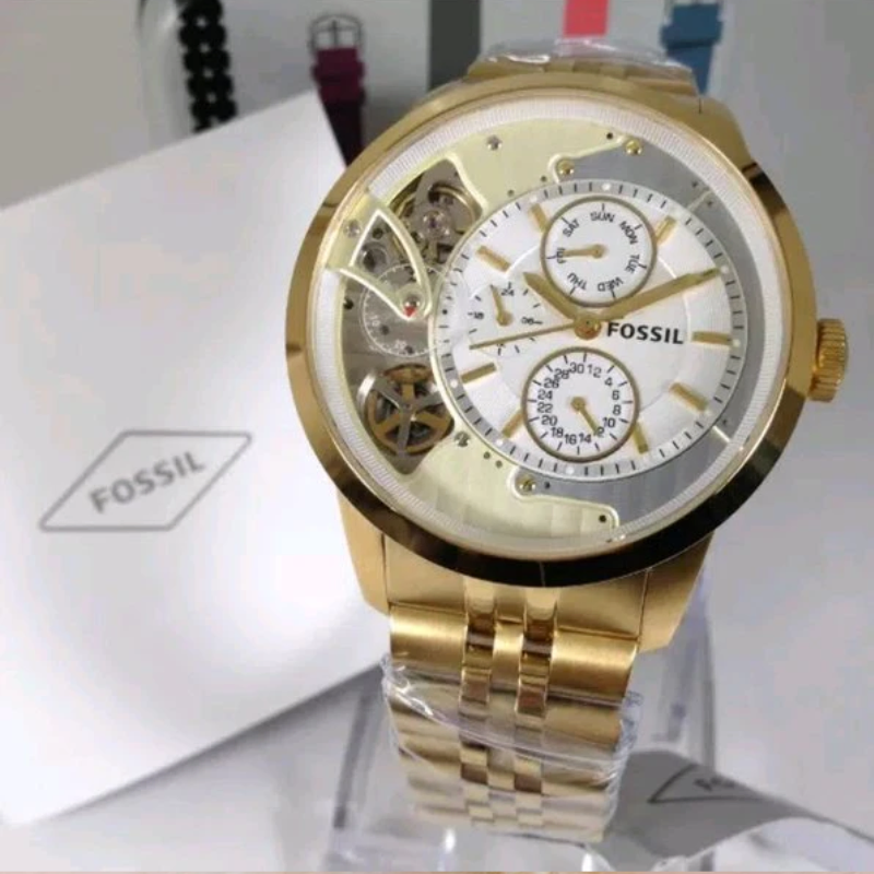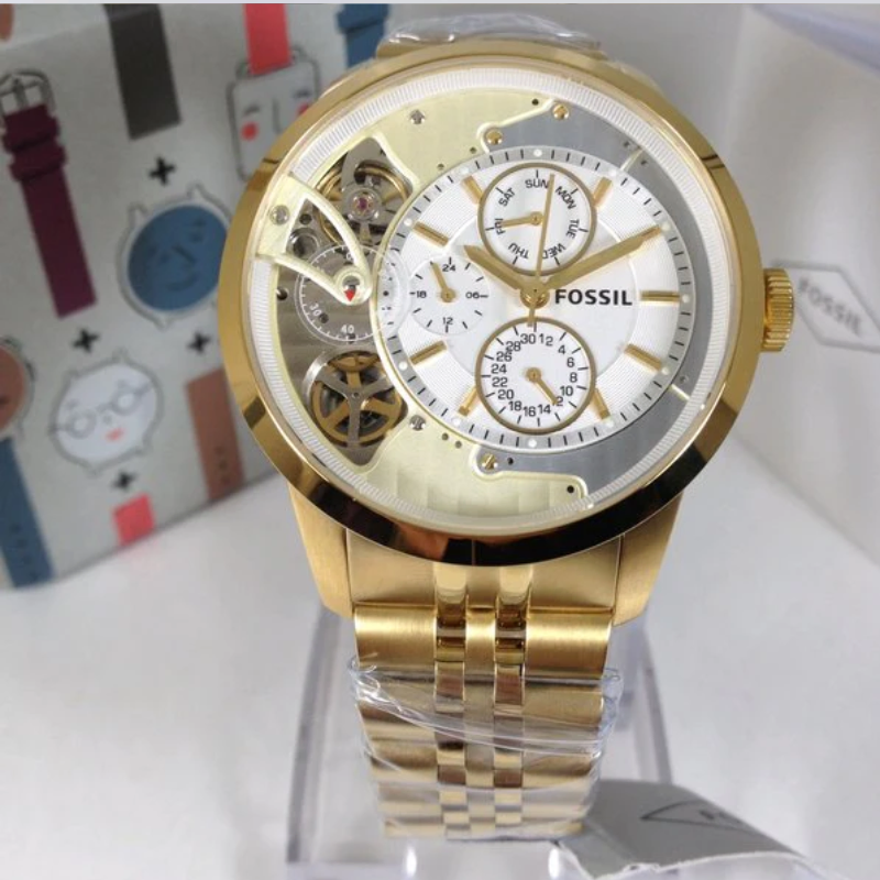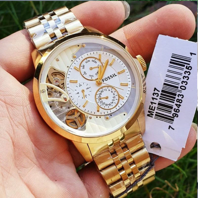 The Fossil ME1137Automatic Watch features a sophisticated skeleton dial with multifunction sub-dials, a gold-tone stainless steel case, and a matching bracelet. Powered by automatic movement, this elegant timepiece blends classic design with modern craftsmanship—perfect for both formal and everyday wear.