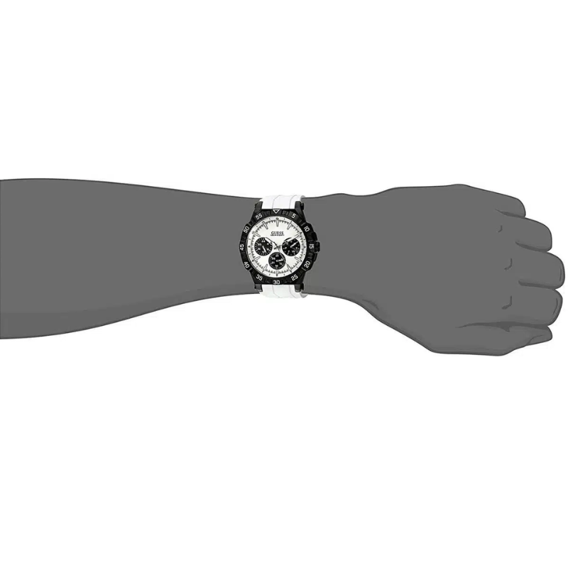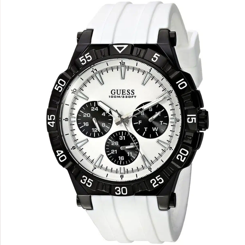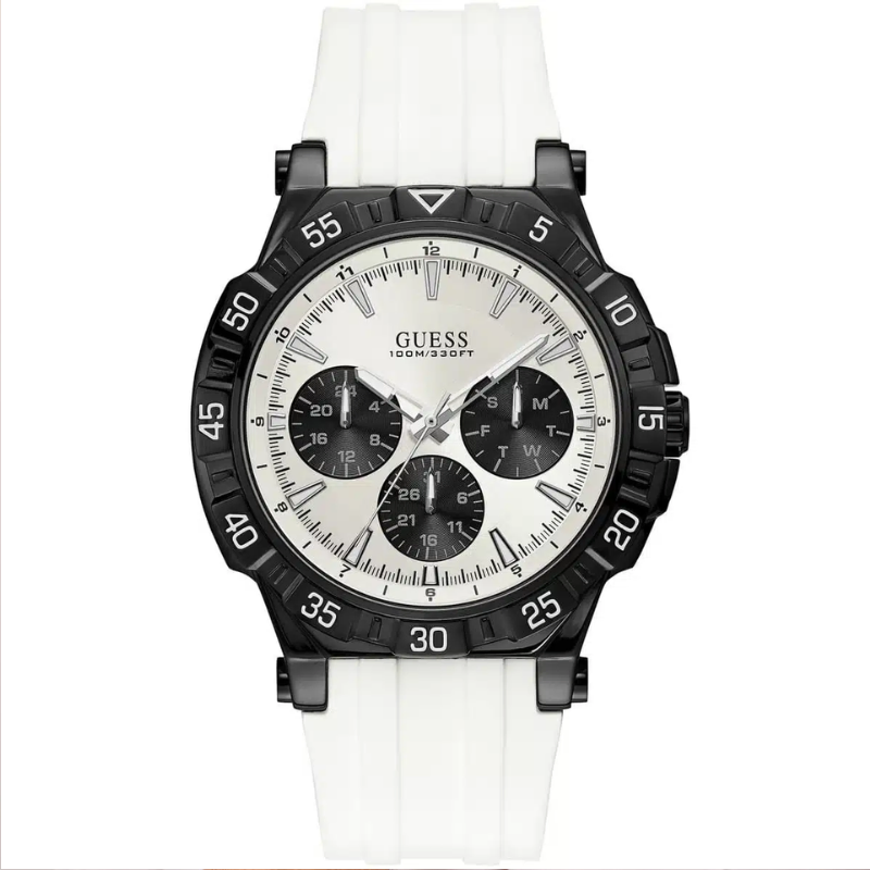 Stylish and sporty GUESS W0966G3 men’s watch featuring a bold black bezel, white dial with multifunction sub-dials, and a comfortable white silicone strap. Water-resistant up to 100M, this premium timepiece combines modern design with reliable performance—perfect for everyday wear and active lifestyles.
