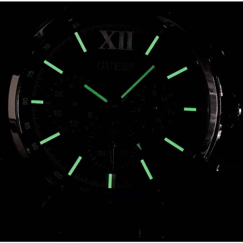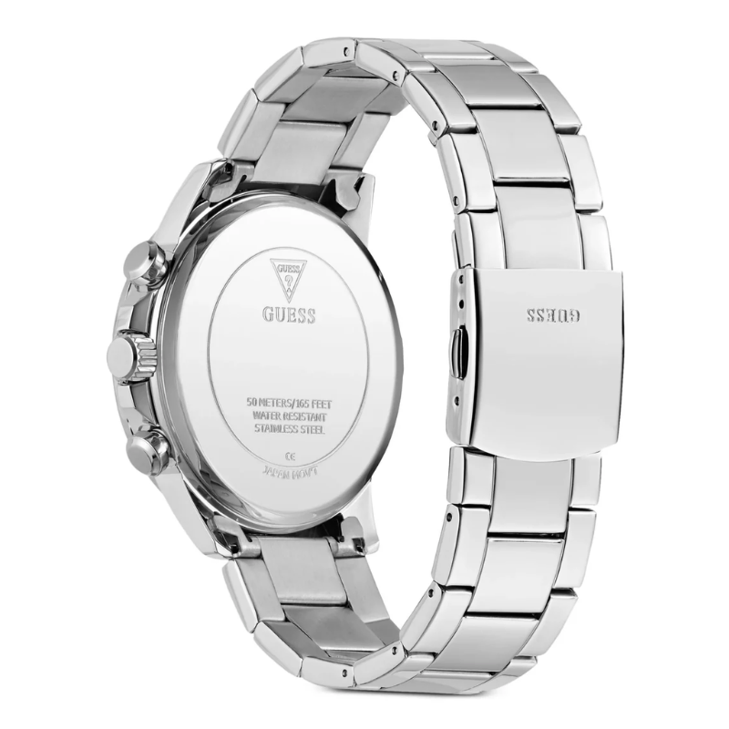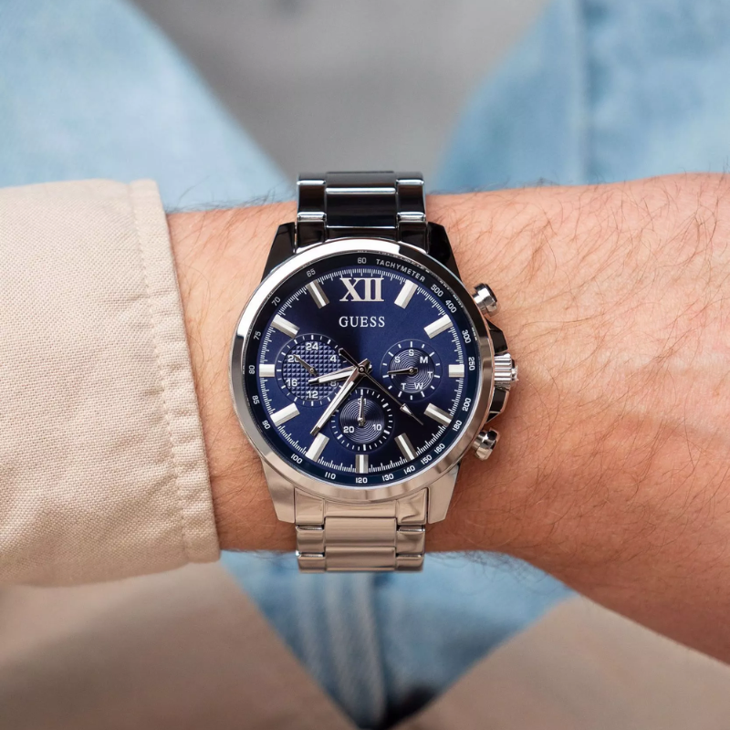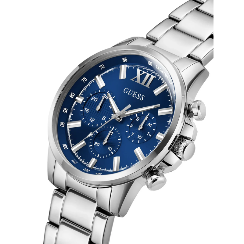 The GUESS GW0900G4men’s watch features a sleek blue chronograph dial with a durable silver-tone stainless steel case and bracelet. Designed for precision and modern style, this multifunction timepiece offers reliable quartz movement and a bold, sophisticated look—perfect for business or every day wear.