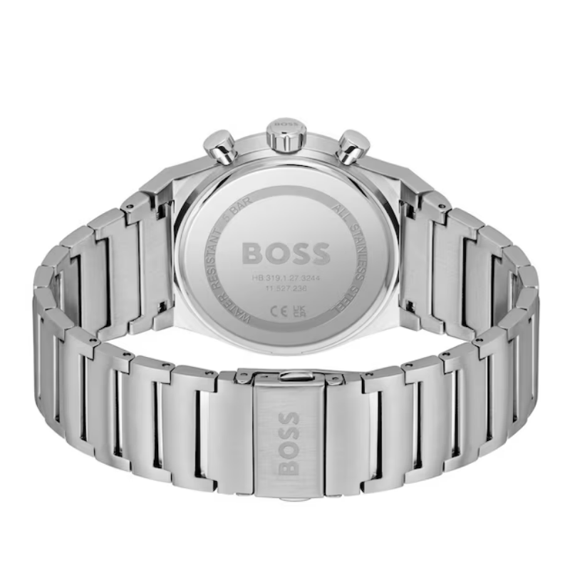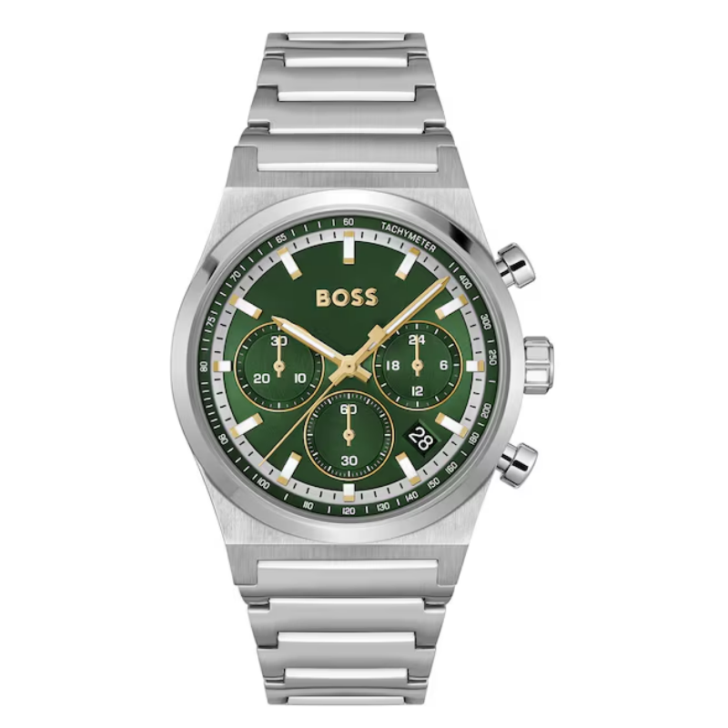 The BOSS 1514220features a bold green dial with gold-tone accents, housed in a 41 mm stainlesssteel case. With three chronograph subdials, a date display, and a sleek steelbracelet, it blends sporty styling with everyday elegance. Powered by a precisequartz movement, it’s built for reliability and standout style.