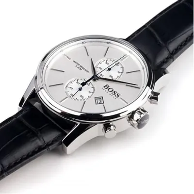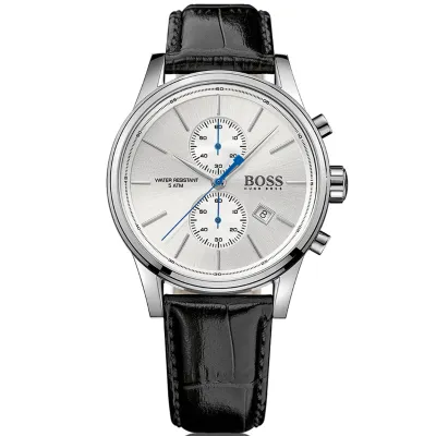 Hugo BossMen's Chronograph Watch has a stainless steel case and is powered by achronograph quartz movement. It fastens a black leather strap and has a silverdial. The watch also has a date function.