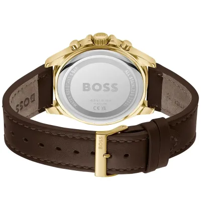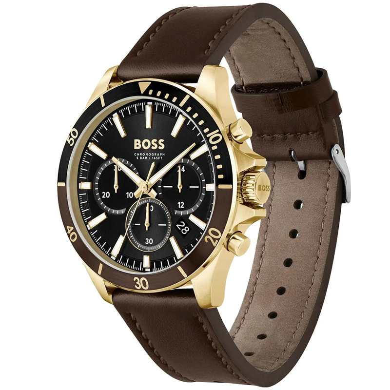 TheHugo Boss Toper watch is a distinguished Men's watch thateffortlessly blends functionality with sophisticated style. Featuring a 45mmround stainless steel case, this timepiece showcases a striking black dialframed by a unique black and brown bezel. The Japan quartz movement ensuresprecise timekeeping, complemented by chronograph functions as well as date,hour, minute, and second indicators.