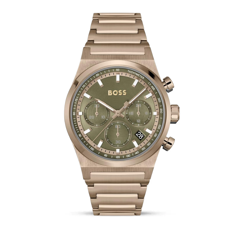 This is a Hugo Bosschronograph wristwatch featuring a sophisticated and contemporary design. Thecase, bezel, and bracelet are finished in a warm rose-gold tone, which gives itan elegant, premium appearance.