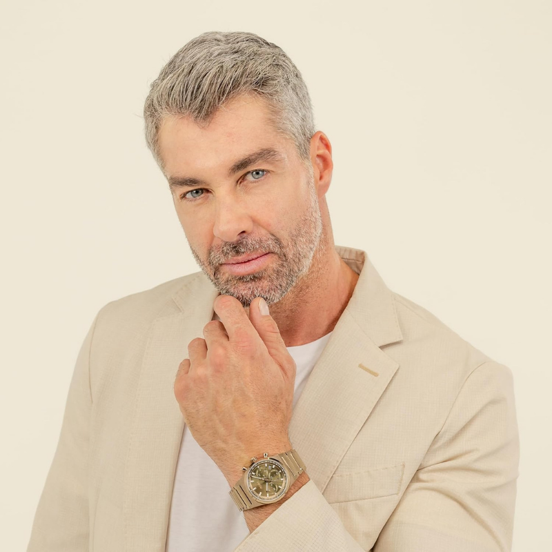 The dial is an olive greencolor that complements the rose-gold metal perfectly, offering a bold yetrefined contrast. It includes three sub-dials (chronograph functions) arrangedsymmetrically, often used for measuring seconds, minutes, and hours. The datedisplay window is located between the 4 and 5 o’clock positions.