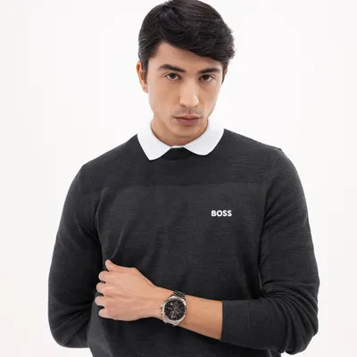 BOSS 1514251 men’schronograph watch with stainless steel bracelet, black dial, tachymeter detail,quartz movement, and date display for a sharp modern look.