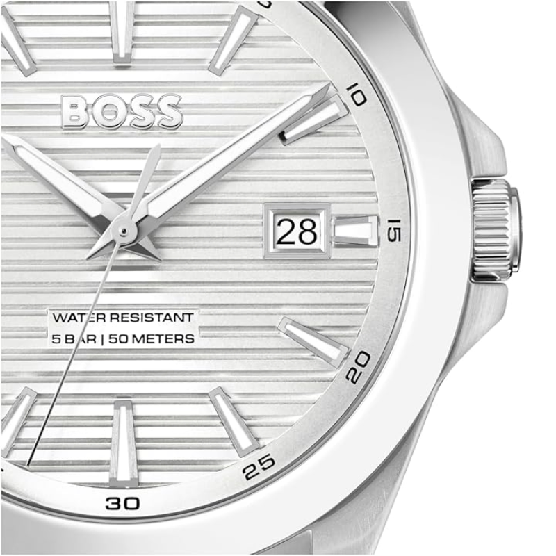 With cool steel and adistinctive textured dial, this BOSS Menswear watch adds understated luxurytouch to any look. H-link bracelet for custom fitting.