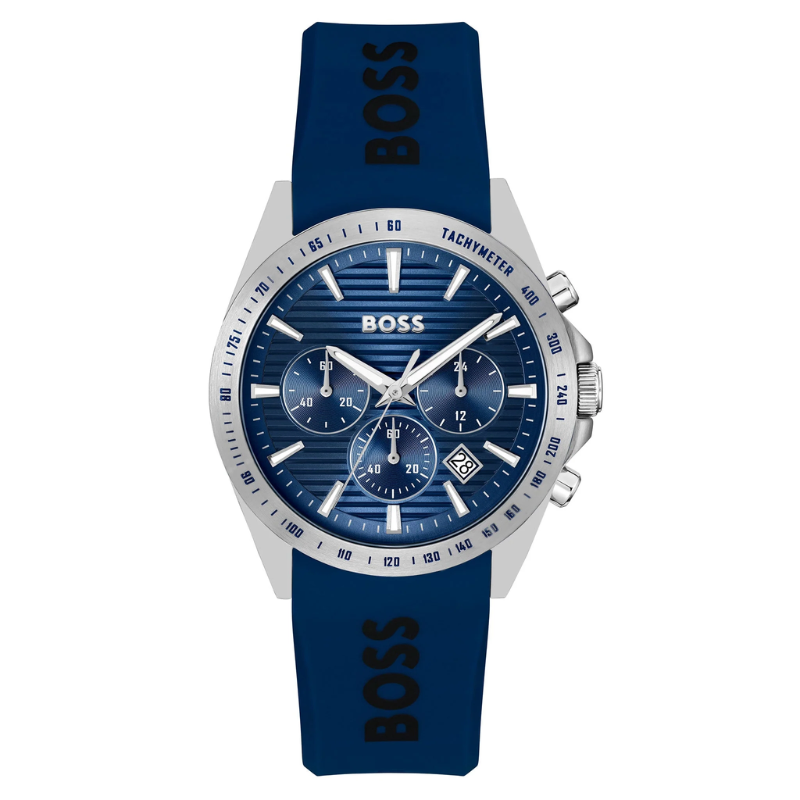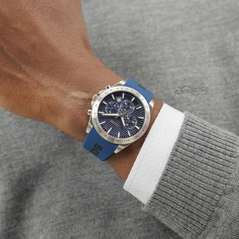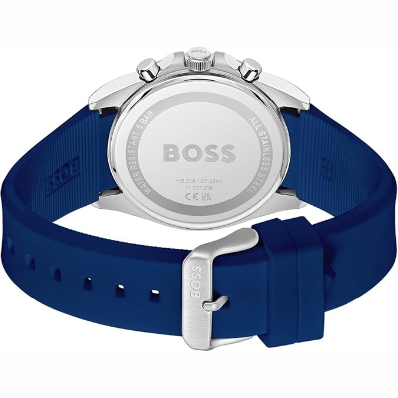 Experience theprecision and style of the Hugo Boss Blue Silicone Dark Blue Dial ChronographMen's Watch - 1514239. Featuring a quartz movement, 41mm case diameter, and10.4mm case thickness, this watch combines function and fashion seamlessly. Thestainless steel case coating and mineral crystal material offer durability andprotection, while the dark blue dial and blue silicone strap provide a bold andsophisticated look. With a water resistance of 5 ATM and a secure tongue buckleclasp, this watch is perfect for both everyday wear and special occasions.Upgrade your accessory game with this must-have timepiece from Hugo Boss!