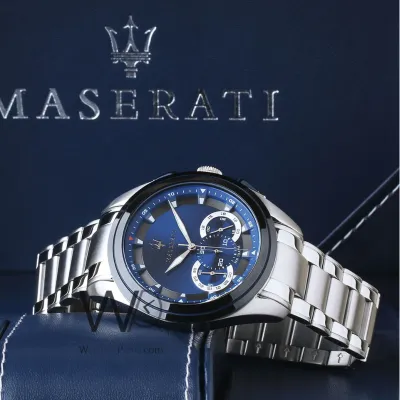 Stainless steel case with a stainless steel bracelet. Fixed black PVD bezel. Blue dial with luminous silver-tone hands and index hour markers. Minute markers around the inner rim. Dial Type: Analog. Luminescent hands and markers. Chronograph - three sub-dials displaying: 60 second, 30 minute and 12 / 24 hour. Miyota caliber JS50 quartz movement. Scratch resistant mineral crystal. Screw down crown. Solid case back. Round case shape. Case size: 45 mm. Case thickness: 12.7 mm. Band width: 22 mm. Fold over clasp with a push button release. Water resistant at 100 meters / 330 feet. Functions: chronograph, hour, minute, second. Traguardo Series. Sport watch style. Watch label: Japan Movt. Maserati Traguardo Chronograph Quartz Blue Dial Men's Watch