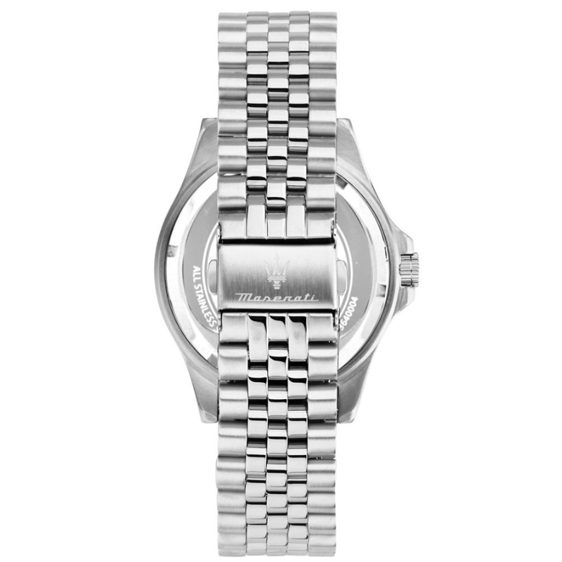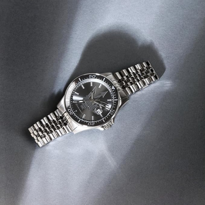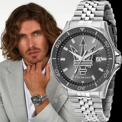 Maserati Men's watch,ref. R8853140010, SFIDA collection, in steel, quartz movement, time, datefunction. The watch is characterized by a steel strap, with a deployment clasp.The watch case measures 44mm, surrounds a gray dial and features a durablemineral glass. Water resistance up to 10 ATM. The watch is shipped in itsoriginal packaging,