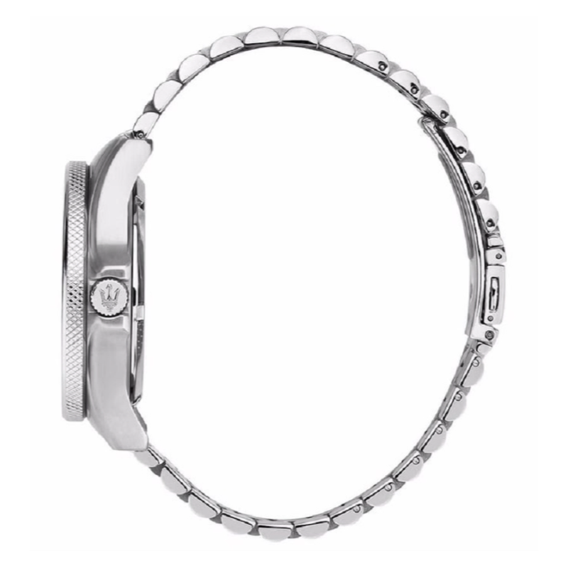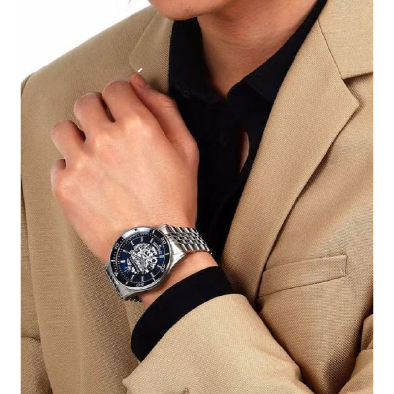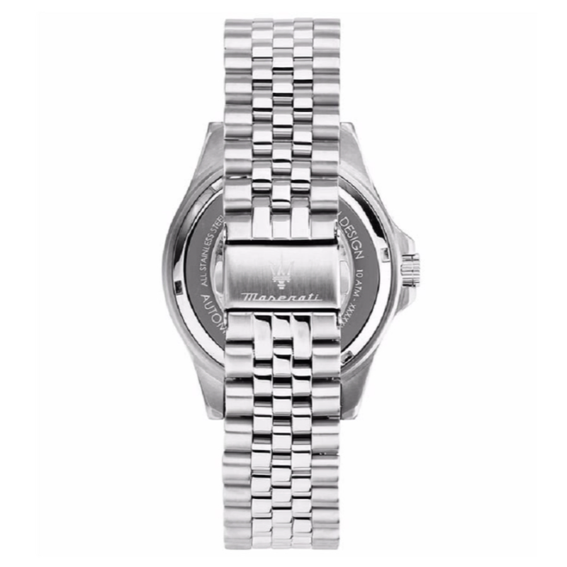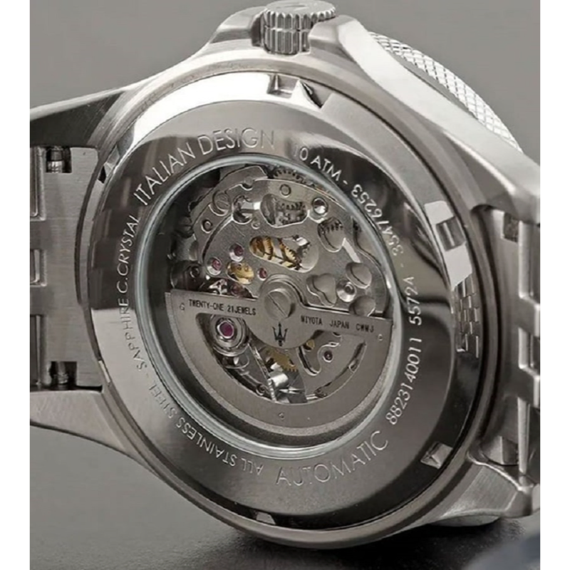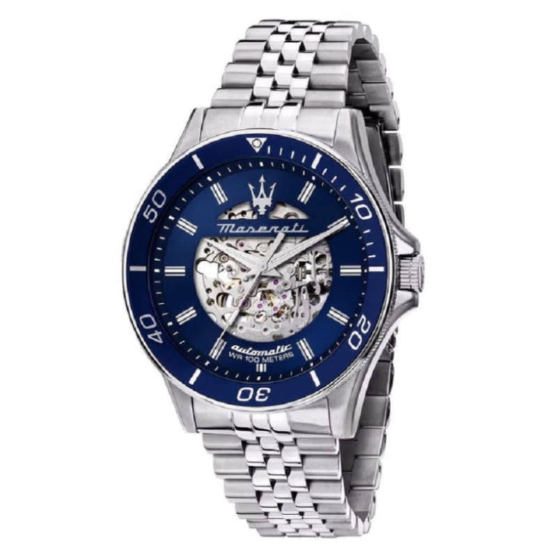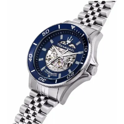 TheMaserati Sfida Skeleton Automatic is asophisticated men's watch for lovers of advanced mechanics and elegance. Itssilver stainless steel envelope surrounds a transparent dial with a visibleJapanese Miyota 8N24 movement, which offers 42 hours of walk reserve and 21jewels. Blue accents on the dial and bezel add a stark contrast, highlightingthe watch's unique character. A hardened mineral glass with sapphire coatingguarantees protection.