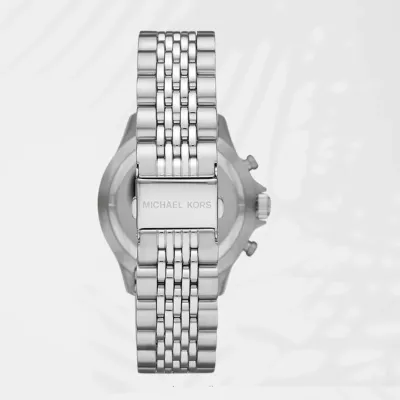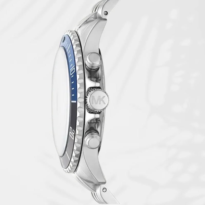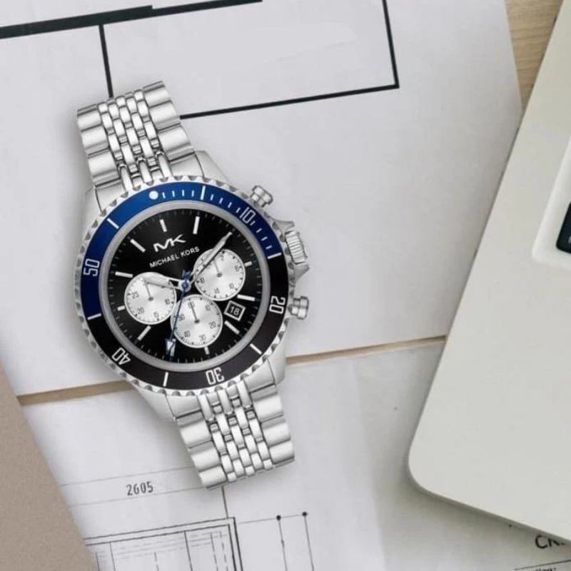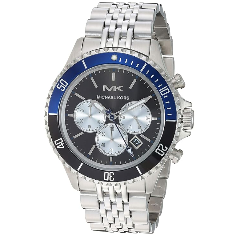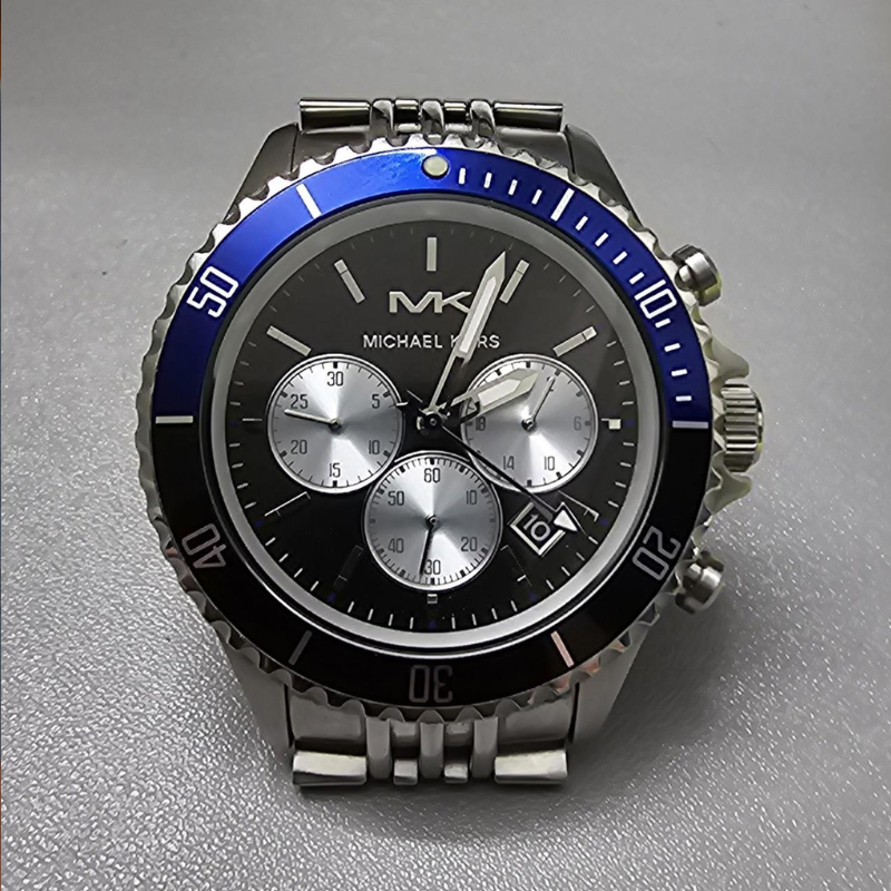 Add a touch of luxuryto your everyday look with the Michael Kors MK8749 Chronograph Watch. Designedwith a polished stainless steel bracelet and a bold black dial, this watch isboth stylish and functional. The blue and black rotating bezel adds a sportyflair, while the chronograph sub-dials and date window enhance itspracticality.