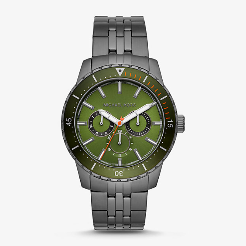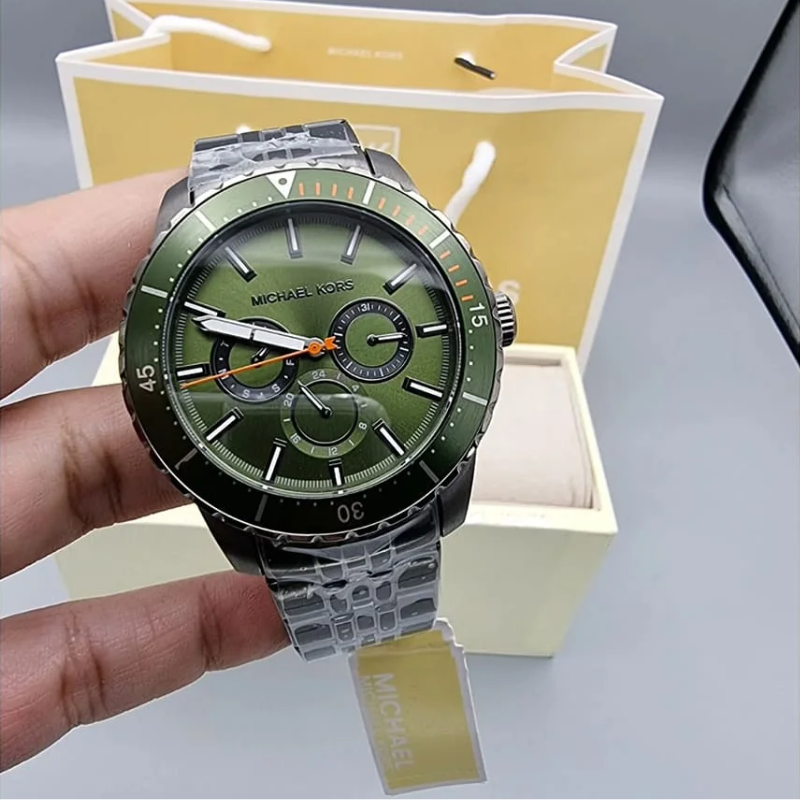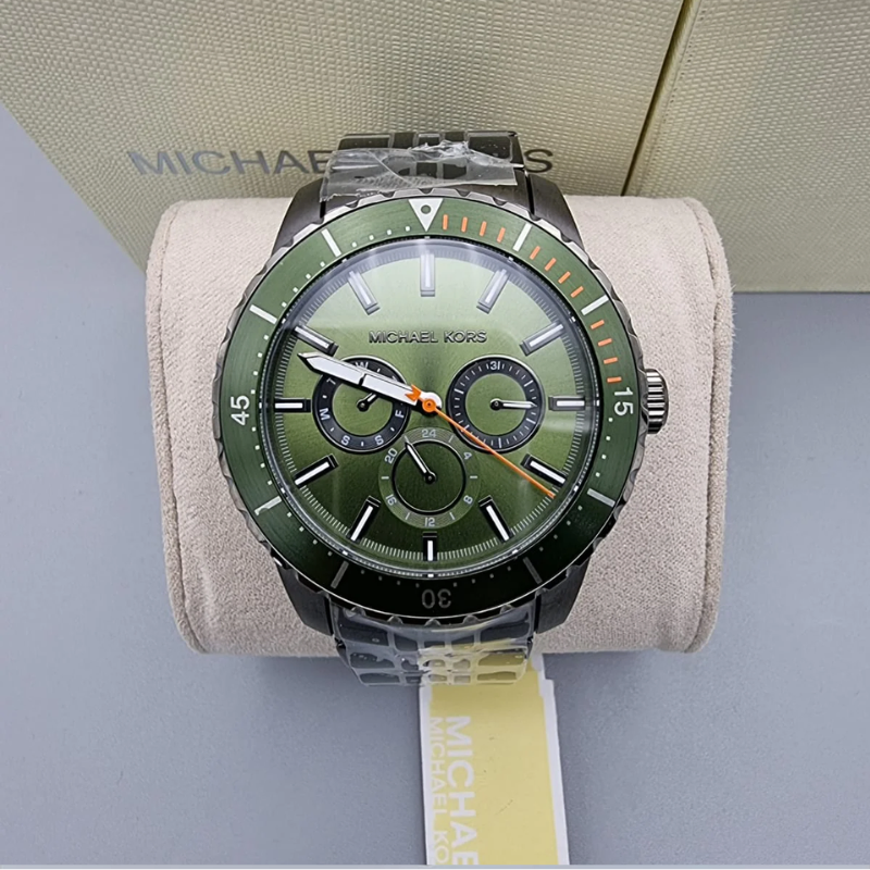 Make a bold statement with theMichael Kors MK7158, designed for men who value both elegance and performance.This stunning timepiece features a radiant emerald green sunray dial, encasedin a stainless steel body with a sleek silver-tone bracelet. The chronographsub-dials add sporty functionality, while the bold orange second hand brings avibrant contrast for easy readability and style.