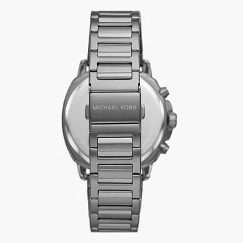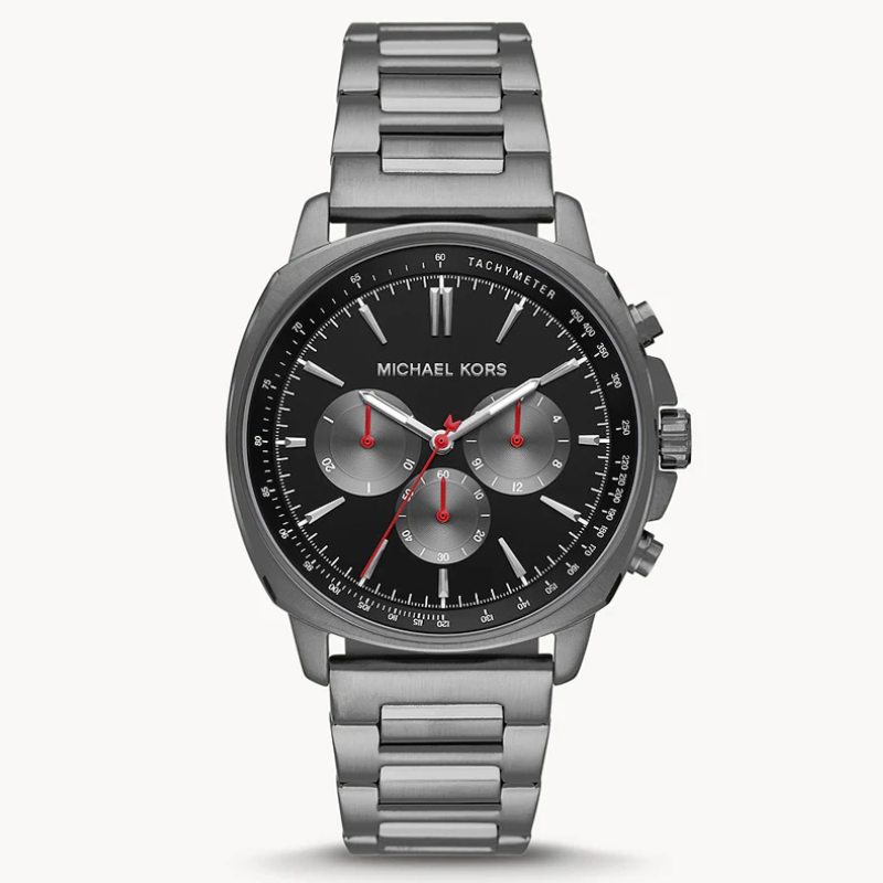Add a bold statementto your wrist with the Michael Kors MK8970 Chronograph Watch. Designed in asleek gunmetal-tone stainless steel, this timepiece features a black dial withthree eye-catching red-accented subdials for stopwatch functionality. Theminimalist indices and tachymeter scale along the bezel give it a sporty yetrefined look — perfect for both casual and formal wear.