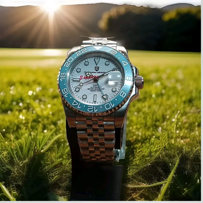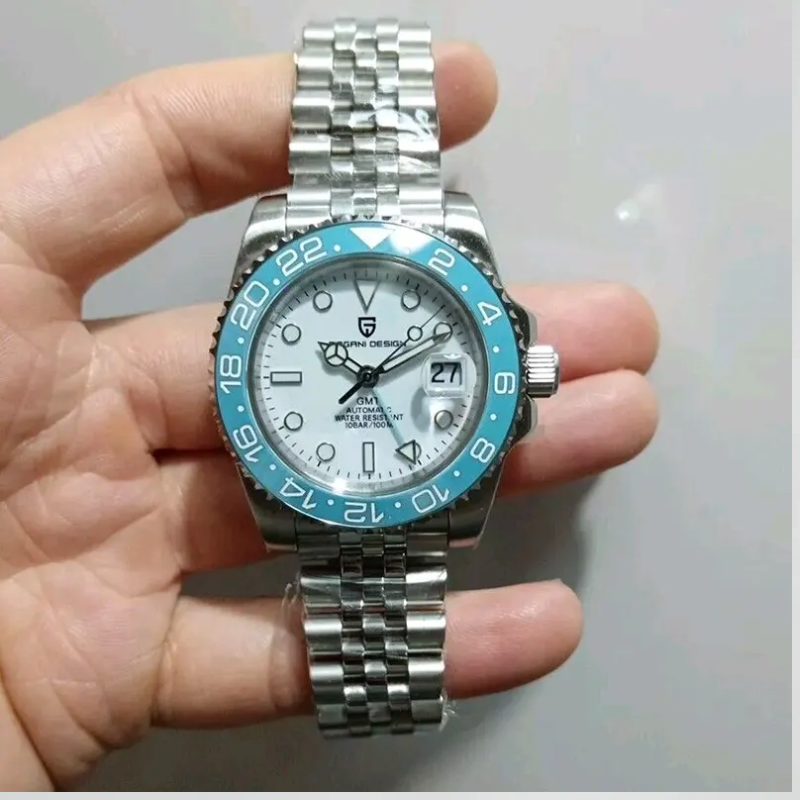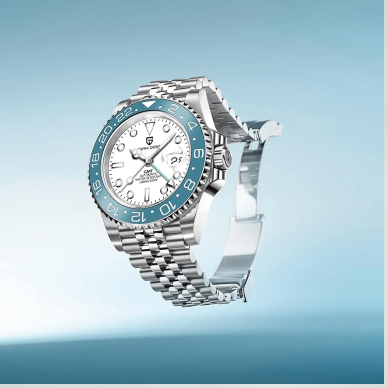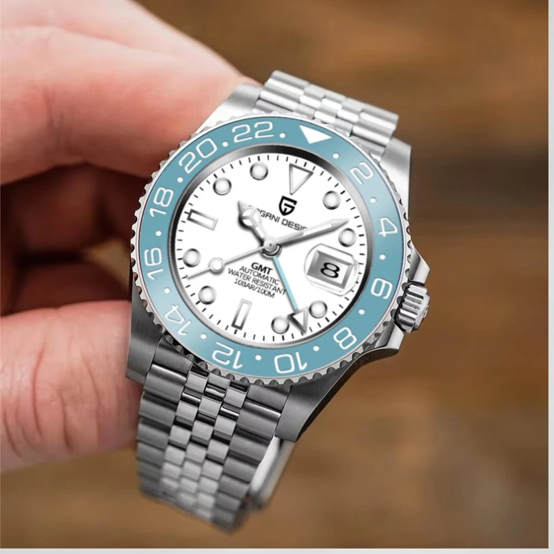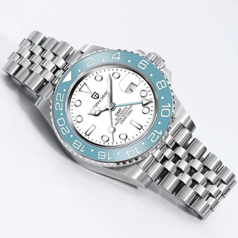 The men's automatic GMT watch Pagani Design PD-1662 has ablack dial, ice blue ceramic bezel, a stainless steel case and band,sapphire crystal, and water resistance of 100 meters.