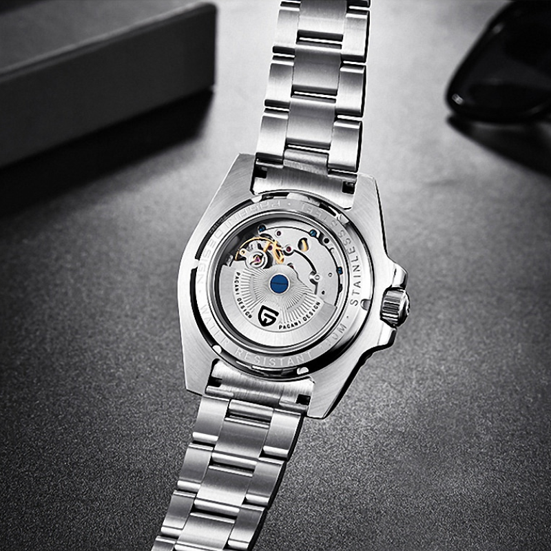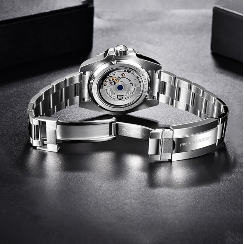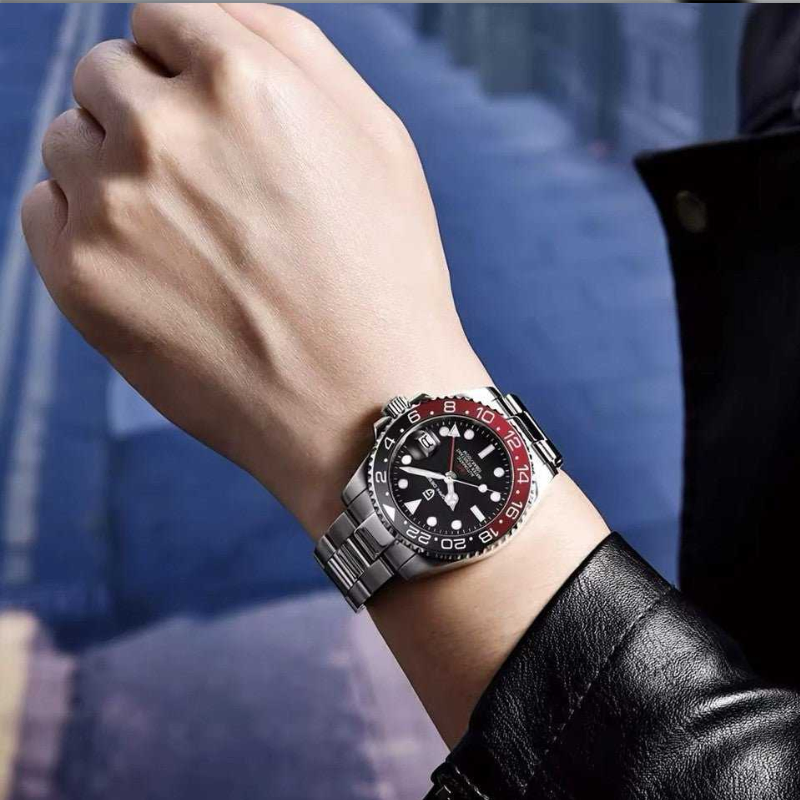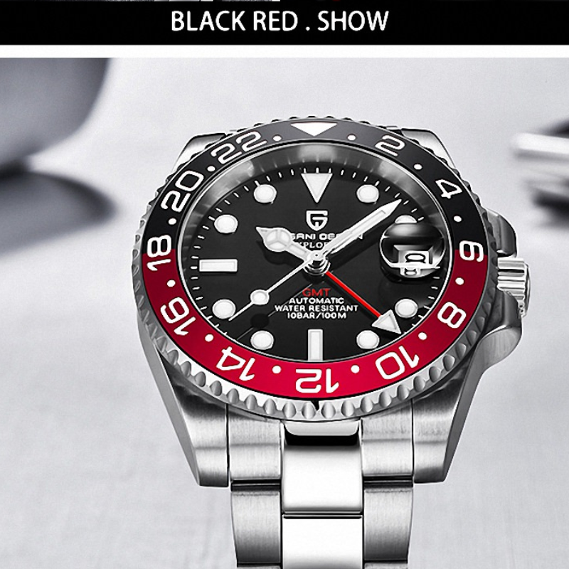 The men's automatic GMT watch Pagani Design PD-1662 has ablack dial, a red-black ceramic bezel, a stainless steel case and band,sapphire crystal, and water resistance of 100 meters.