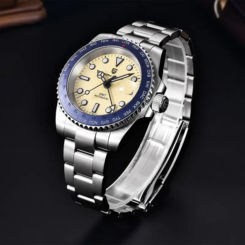 Pagani Design PD-1758 men’s automatic GMT watch withcream dial, stainless steel case and bracelet, sapphire crystal, and classictravel-ready design.