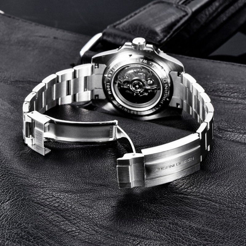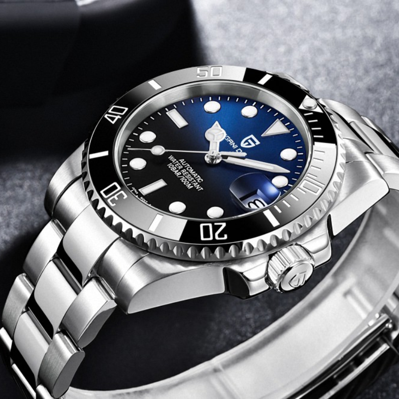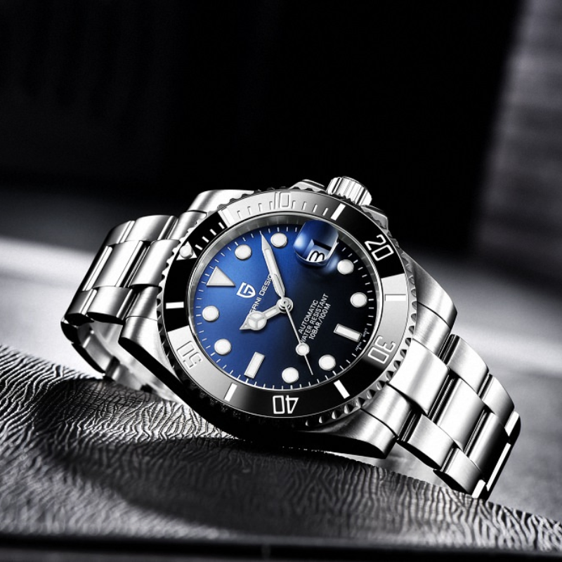 Pagani DesignSubmariner PD-1661 boasts a stunning blue-black bezel, stainless steel build,luminous markers, and automatic movement—combining elegance and performance forthe modern, adventurous man