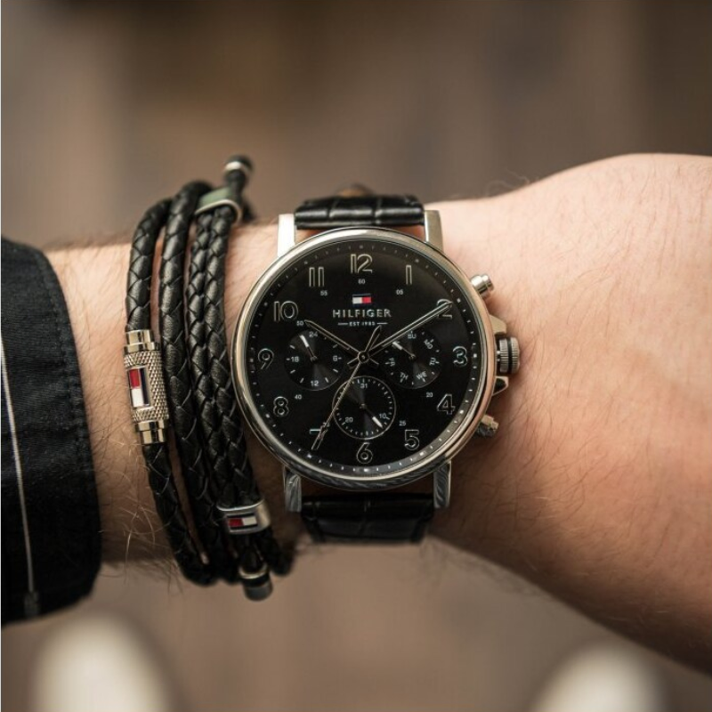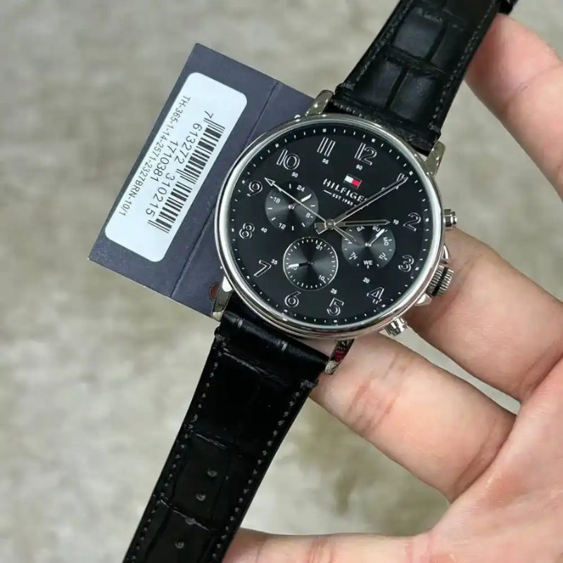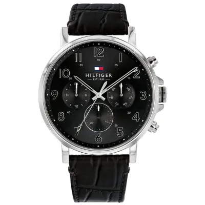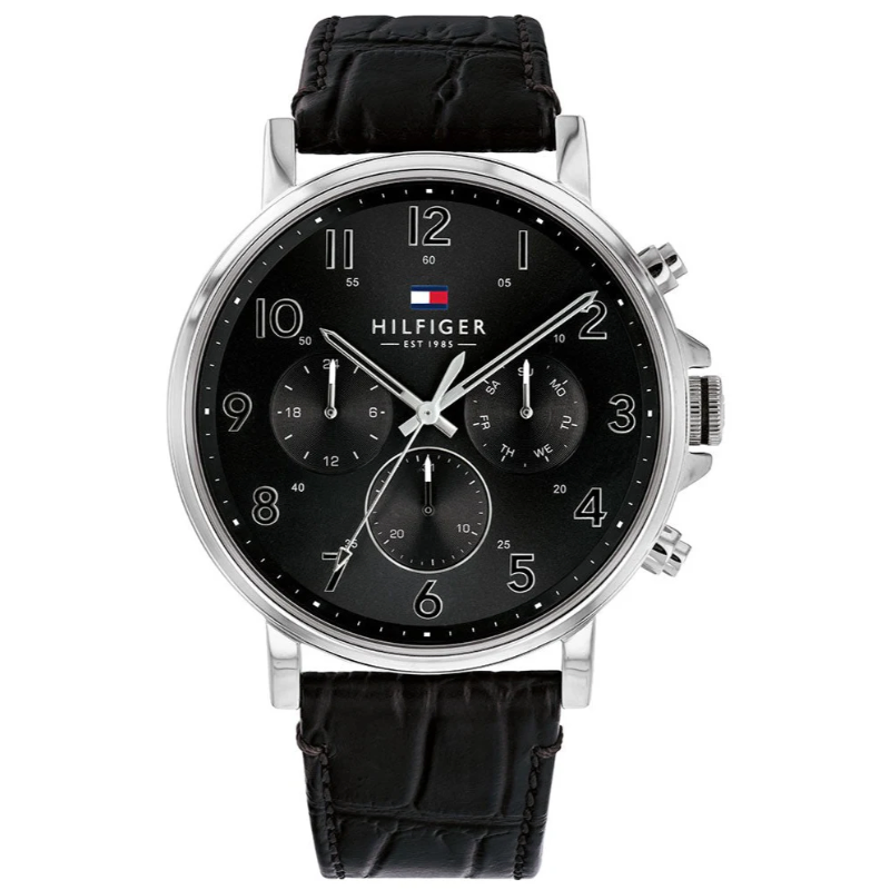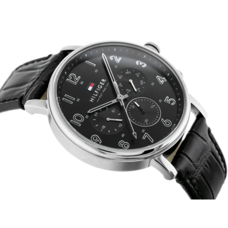 A dressed-up classic, this watch features a solid stainless steel case. The multi-function sunray dial has Arabic numerals and a minute detailed outer ring. This watch is completed with a smooth black crocodile-embossed leather strap.