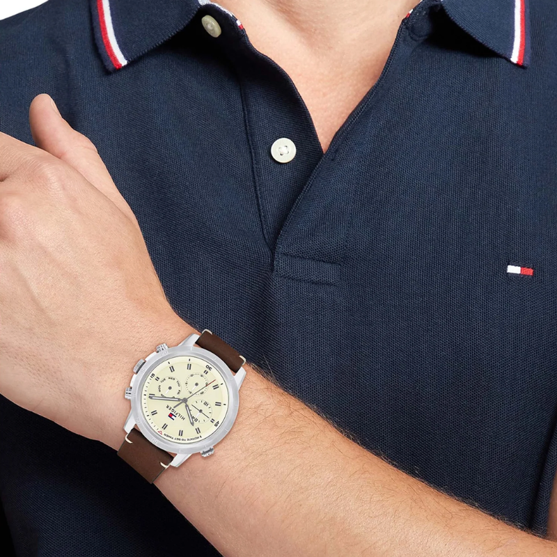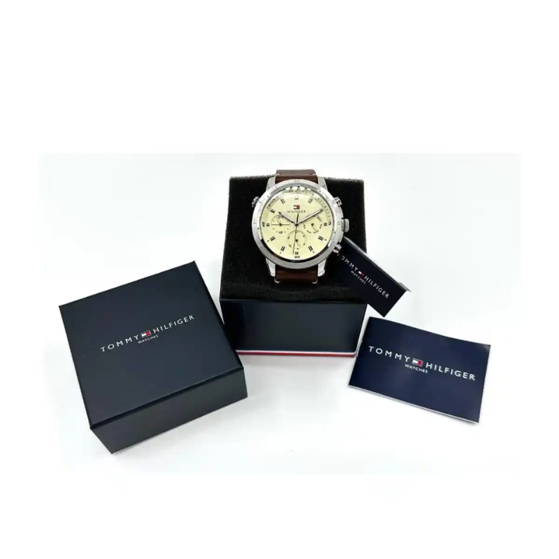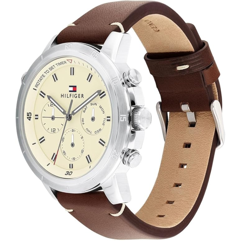 Introducing the TommyHilfiger TROY 1792102, a sophisticated and versatile timepiece thateffortlessly combines style and functionality. This multifunctional watchboasts a recycled stainless steel case, measuring a sleek 44mm in diameter. Theelegant parchment dial adds a touch of timeless charm to its overall design.Completing the look is a rich brown leather strap, exuding a sense of refinedelegance. With a water resistance of 5ATM, this Tommy Hilfiger timepiece is notonly a fashion statement but also a reliable companion for any occasion.Elevate your wrist game with the Tommy Hilfiger TROY 1792102, a true embodimentof the brand's signature craftsmanship and attention to detail.