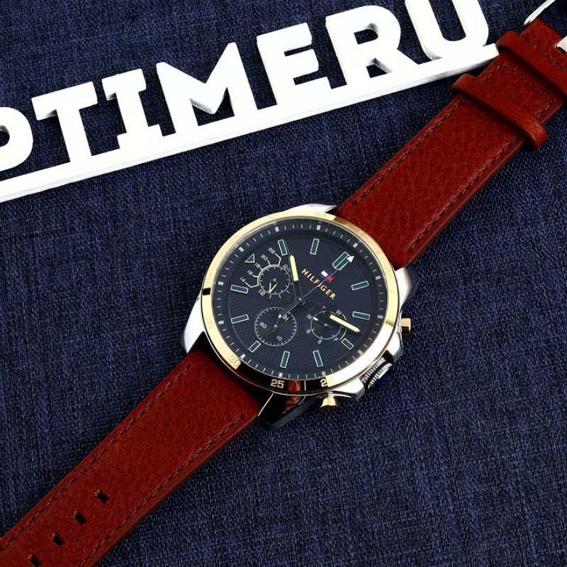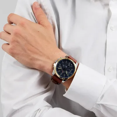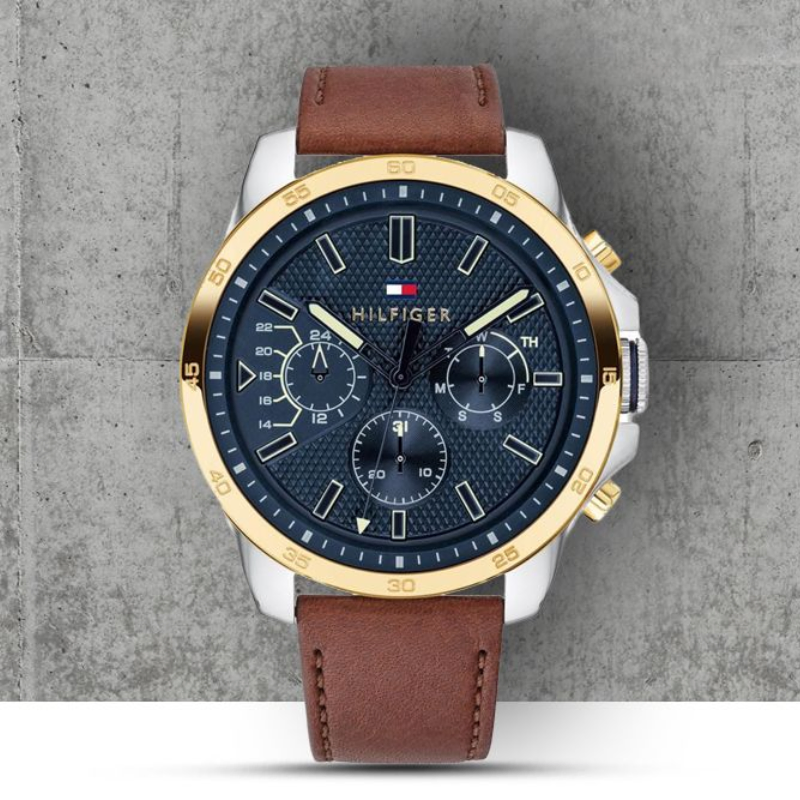 This Tommy Hilfigermen's watch is the flagship model of the season and it's not hard to see why.Its handsome navy face and luxurious gold bezel contrast brilliantly with theclassic brown smooth leather strap. Its two-tone stainless steel case andmulti-eye face add even more features to this must have watch.